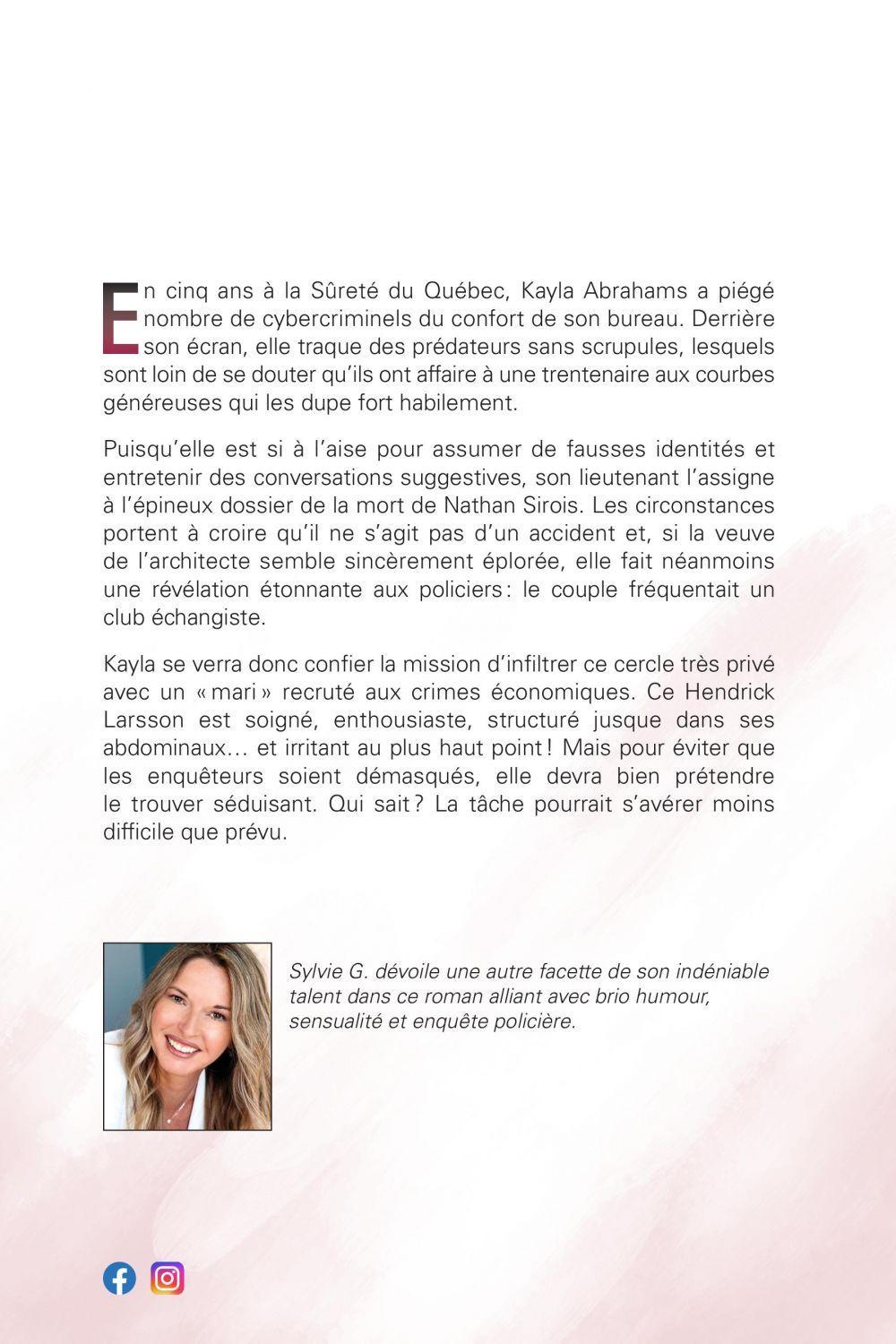 En cinq ans à la Sûreté du Québec, Kayla Abrahams a piégé nombre de cybercriminels du confort de son bureau. Derrière son écran, elle traque des prédateurs sans scrupules, lesquels sont loin de se douter qu’ils ont affaire à une trentenaire aux courbes généreuses qui les dupe fort habilement. Puisqu’elle est si à l’aise pour assumer de fausses identités et entretenir des conversations suggestives, son lieutenant l’assigne à l’épineux dossier de la mort de Nathan Sirois. Les circonstances portent à croire qu’il ne s’agit pas d’un accident et, si la veuve de l’architecte semble sincèrement éplorée, elle fait néanmoins une révélation étonnante aux policiers : le couple fréquentait un club échangiste. Kayla se verra donc confier la mission d’infiltrer ce cercle très privé avec un « mari » recruté aux crimes économiques. Ce Hendrick Larsson est soigné, enthousiaste, structuré jusque dans ses abdominaux… et irritant au plus haut point ! Mais pour éviter que les enquêteurs soient démasqués, elle devra bien prétendre le trouver séduisant. Qui sait ? La tâche pourrait se révéler moins difficile que prévu.