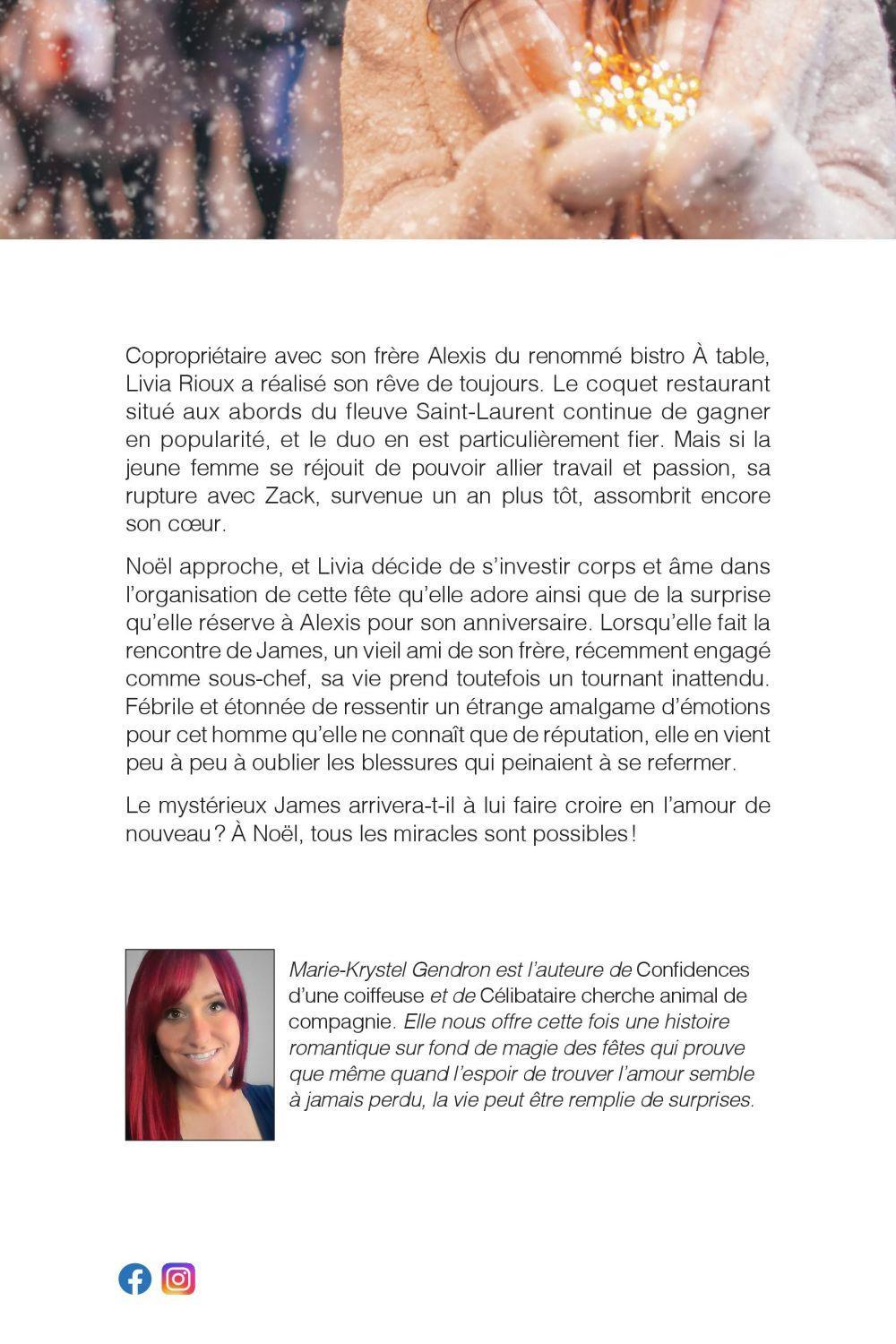 Copropriétaire avec son frère Alexis du renommé bistro À Table!, Livia Rioux mène de front la brillante carrière dont elle a toujours rêvé. Le coquet restaurant situé aux abords du fleuve Saint-Laurent continue de gagner en popularité, et le duo en est particulièrement fier. Mais si la jeune femme se réjouit de pouvoir allier travail et passion, sa rupture avec Zack, survenue un an plus tôt, vient encore assombrir son coeur. Noël approche, et Livia décide de s’investir corps et âme dans l’organisation de cette fête qu’elle adore ainsi que de la surprise qu’elle réserve à Alexis pour son anniversaire. Mais lorsqu’elle fait la rencontre de James, un vieil ami de son frère, récemment engagé comme sous-chef, sa vie prendra un tournant inattendu. Fébrile et étonnée de ressentircet amalgame d’émotions pour cet homme qu’elle ne connaît que de réputation, elle en viendra peu à peu à oublier les blessures qui peinaient à se refermer. Le mystérieux James arrivera-t-il à lui faire croire en l’amour de nouveau ? À Noël, tout est possible, même les miracles !