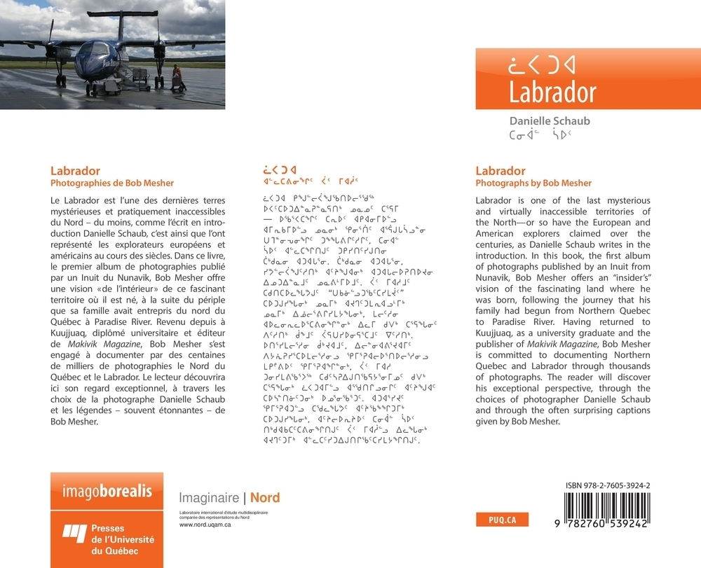 Labrador – Photographies de Bob MesherLe Labrador est l’une des dernières terres mystérieuses et pratiquement inaccessibles du Nord – du moins, comme l’écrit en introduction Danielle Schaub, c’est ainsi que l’ont représenté les explorateurs européens et américains au cours des siècles. Dans ce livre, le premier album de photographies publié par un Inuit du Nunavik, Bob Mesher offre une vision « de l’intérieur » de ce fascinant territoire où il est né, à la suite du périple que sa famille avait entrepris du nord du Québec à Paradise River. Revenu depuis à Kuujjuaq, diplômé universitaire et éditeur de Makivik Magazine, Bob Mesher s’est engagé à documenter par des centaines de milliers de photographies le Nord du Québec et le Labrador. Le lecteur découvrira ici son regard exceptionnel, à travers les choix de la photographe Danielle Schaub et les légendes – souvent étonnantes – de Bob Mesher.Labrador – Photographs by Bob MesherLabrador is one of the last mysterious and virtually inaccessible territories of the North—or so have the European and American explorers claimed over the centuries, as Danielle Schaub writes in the introduction. In this book, the first album of photographs published by an Inuit from Nunavik, Bob Mesher offers an “insider’s” vision of the fascinating land where he was born, following the journey that his family had begun from Northern Quebec to Paradise River. Having returned to Kuujjuaq, as a university graduate and the publisher of Makivik Magazine, Bob Mesher is committed to documenting Northern Quebec and Labrador through thousands of photographs. The reader will discover his exceptional perspective, through the choices of photographer Danielle Schaub and through the often surprising captions given by Bob Mesher.