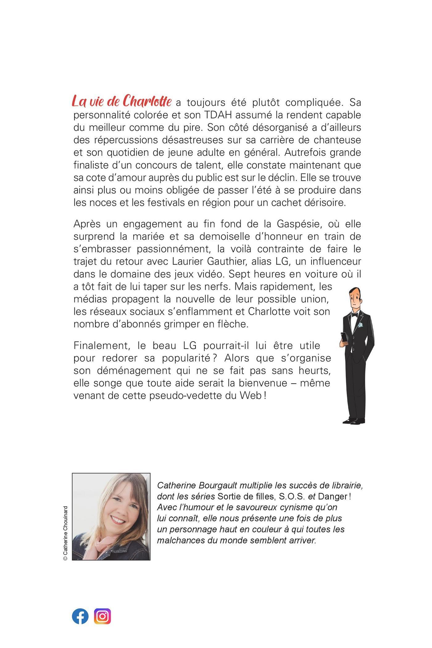 La vie de Charlotte a toujours été plutôt compliquée. Sa personnalité colorée et son TDAH assumé la rendent capable du meilleur comme du pire. Son côté désorganisé a d’ailleurs des répercussions désastreuses sur sa carrière de chanteuse et sa vie de jeune adulte en général. Autrefois grande finaliste d’un concours de talent,elle constate maintenant que sa cote d’amour auprès du public est sur le déclin. Elle passe donc l’été à se produire dans les noces et les festivals en région pour un cachet ridicule. Après un engagement au fin fond de la Gaspésie, où elle surprend la mariée et sa demoiselle d’honneuren train de s’embrasser, la voilà contrainte de faire le trajet du retour avec Laurier Gauthier, alias LG, un influenceur dans le domaine des jeux vidéo. Sept heures en voiture où il a tôt fait de lui taper sur les nerfs… Mais rapidement, les médias propagent la nouvelle de leur possible union, les réseaux sociaux s’enflamment et Charlotte voit son nombre d’abonnés grimper en flèche. Finalement, le beau LG pourrait-il lui être utile pour redorer sa popularité ? Alors que s’organise son déménagement qui ne se fait pas sans heurts, elle songe que toute aide serait la bienvenue – même venant de cette pseudo-vedette du Web !