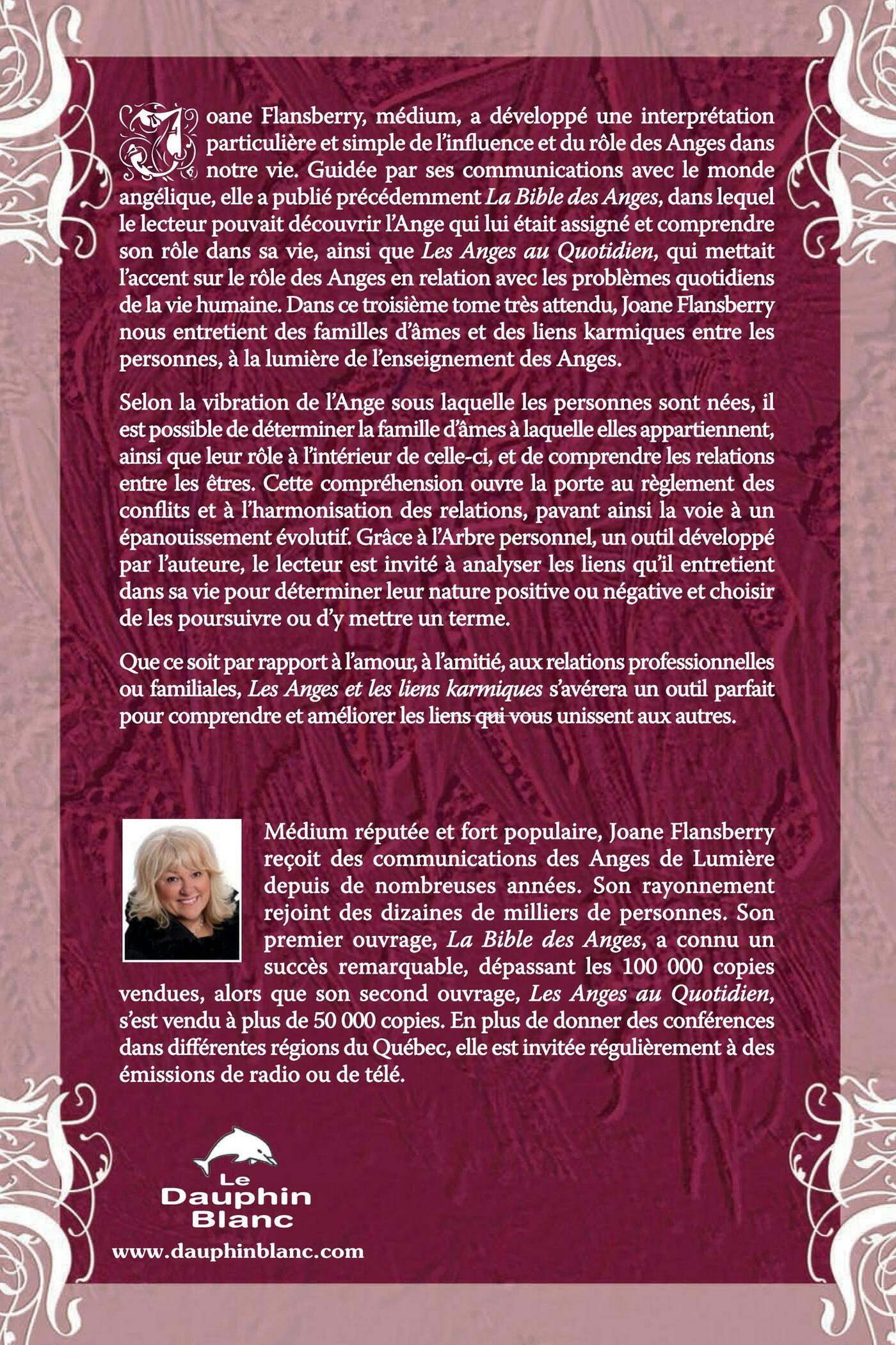 Joane Flansberry, médium, a développé une interprétation particulière et simple de l'influence et du rôle des Anges dans notre vie. Guidée par ses communications avec le monde angélique, elle a publié précédemment La Bible des Anges, dans lequel le lecteur pouvait découvrir l'Ange qui lui était assigné et comprendre son rôle dans sa vie, ainsi que Les Anges au Quotidien, qui mettait l'accent sur le rôle des Anges en relation avec les problèmes quotidiens de la vie humaine. Dans ce troisième tome très attendu, Joane Flansberry nous entretient des familles d'âmes et des liens karmiques entre les personnes, à la lumière de l'enseignement des Anges. Selon la vibration de l'Ange sous laquelle les personnes sont nées, il est possible de déterminer la famille d'âmes à laquelle elles appartiennent, ainsi que leur rôle à l'intérieur de celle-ci, et de comprendre les relations entre les êtres. Cette compréhension ouvre la porte au règlement des conflits et à l'harmonisation des relations, pavant ainsi la voie à un épanouissement évolutif. Grâce à l'Arbre personnel, un outil développé par l'auteure, le lecteur est invité à analyser les liens qu'il entretient dans sa vie pour déterminer leur nature positive ou négative et choisir de les poursuivre ou d'y mettre un terme.Auteure :Médium réputée et fort populaire, Joane Flansberry reçoit des communications des Anges de Lumière depuis de nombreuses années. Son rayonnement rejoint des dizaines de milliers de personnes. Son premier ouvrage, La Bible des Anges, a connu un succès remarquable, dépassant les 100 000 copies vendues, alors que son second ouvrage, Les Anges au Quotidien, s’est vendu à plus de 50 000 copies. En plus de donner des conférences dans différentes régions du Québec, elle est invitée régulièrement à des émissions de radio ou de télé.