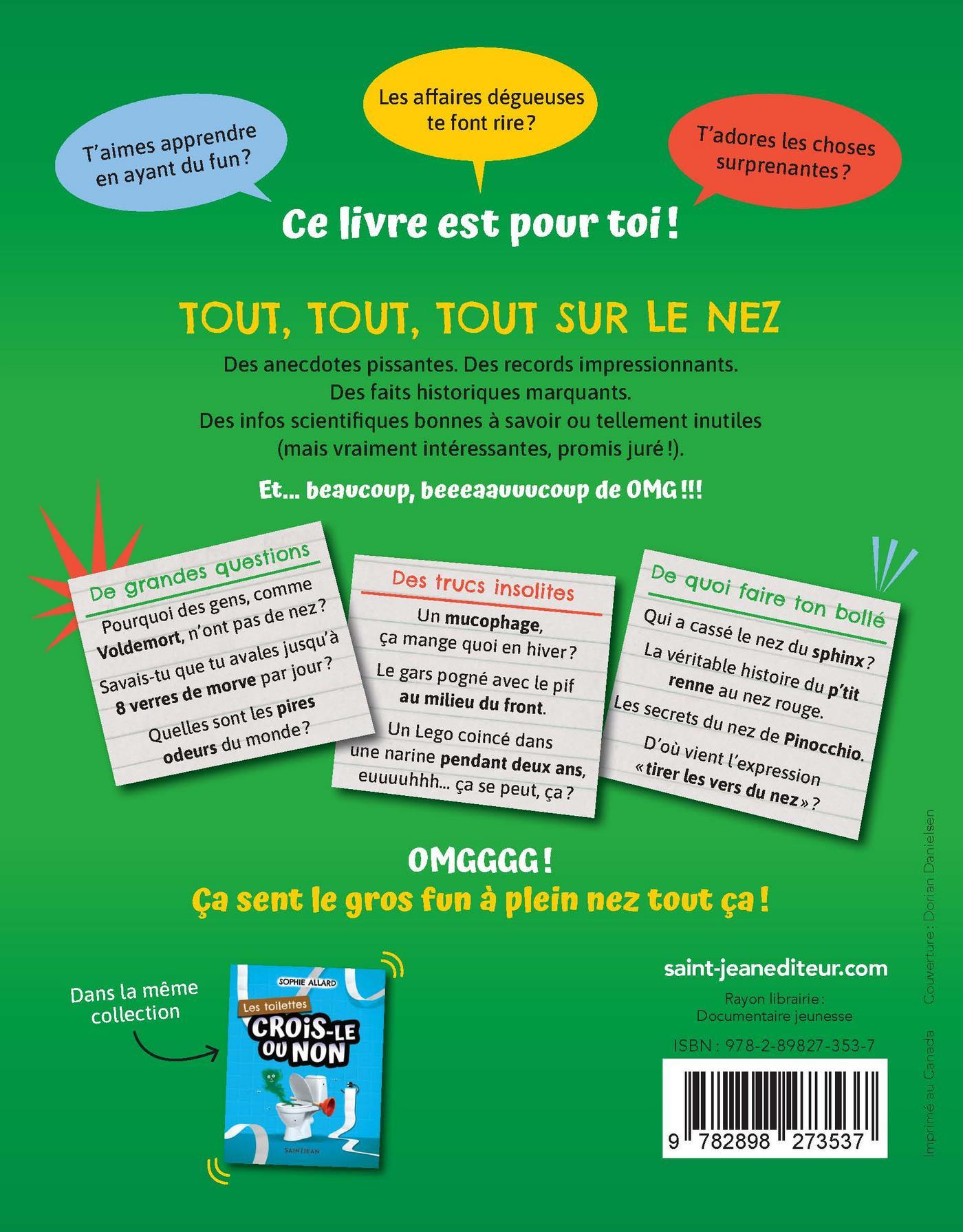 T’aimes apprendre en ayant du fun ?T’adores les choses surprenantes ?Les affaires dégueuses te font rire ?Ce livre est pour toi !TOUT, TOUT, TOUT SUR LE NEZ Des anecdotes pissantes. Des records impressionnants. Des faits historiques marquants. Des infos scientifiques bonnes à savoir ou tellement inutiles (mais vraiment intéressantes, promis juré !). Et… beaucoup, beeeaauuucoup de OMG !!! De grandes questions Pourquoi des gens, comme Voldemort, n’ont pas de nez ? Savais-tu que tu avales jusqu’à 8 verres de morve par jour ? Quelles sont les pires odeurs du monde ? Des trucs insolites Un mucophage, ça mange quoi en hiver ? Le gars pogné avec le pif au milieu du front. Un Lego coincé dans une narine pendant deux ans, euuuuhhh… ça se peut, ça ? De quoi faire ton bollé Qui a cassé le nez du sphinx ? La véritable histoire du p’tit renne au nez rouge. Les secrets du nez de Pinocchio. D’où vient l’expression « tirer les vers du nez » ?OMGGGG ! Ça sent le gros fun à plein nez tout ça !