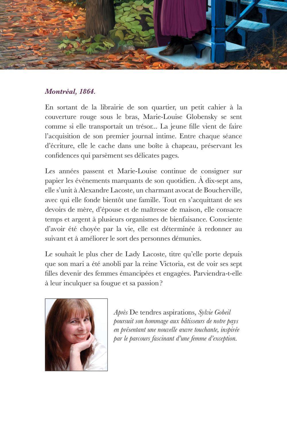 Montréal, 1864. En sortant de la librairie de son quartier, un petit cahier à la couverture rouge sous le bras, Marie-Louise Globensky se sent comme si elle transportait un trésor... La jeune fille vient de faire l'acquisition de son premier journal intime. Entre chaque séance d'écriture, elle le cache dans une boîte à chapeau, préservant les confidences qui parsèment ses délicates pages.Les années passent et Marie-Louise continue de consigner sur papier les événements marquants de son quotidien. A dix-sept ans, elle s'unit à Alexandre Lacoste, un charmant avocat de Boucherville, avec qui elle fonde bientôt une famille. Tout en s'acquittant de ses devoirs de mère, d'épouse et de maîtresse de maison, elle consacre temps et argent à plusieurs organismes de bienfaisance. Consciente d'avoir été choyée par la vie, elle est déterminée à redonner au suivant et à améliorer le sort des personnes démunies.Le souhait le plus cher de Lady Lacoste, titre qu'elle porte depuis que son mari a été anobli par la reine Victoria, est de voir ses sept filles devenir des femmes émancipées et engagées. Parviendra-t-elle à leur inculquer sa fougue et sa passion ?