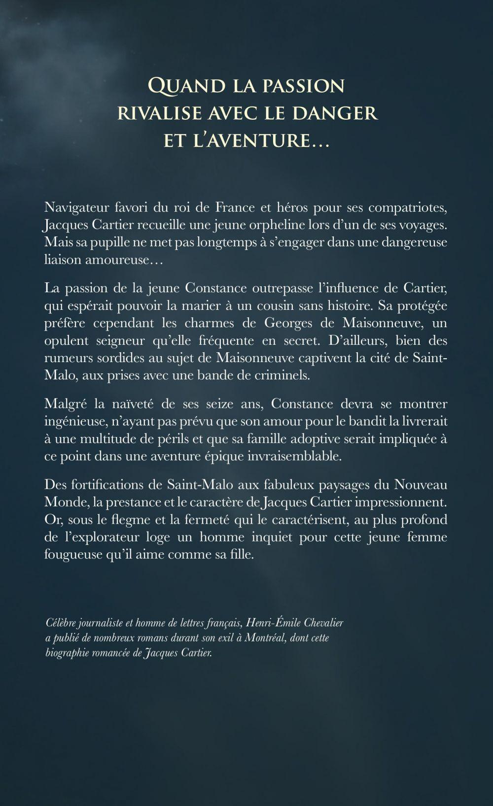Navigateur favori du roi de France et héros pour ses compatriotes, Jacques Cartier recueille une jeune orpheline lors d'un de ses voyages. Mais sa pupille ne met pas longtemps à s'engager dans une dangereuse liaison amoureuse…La passion de la jeune Constance outrepasse l'influence de Cartier, qui espérait pouvoir la marier à un cousin sans histoire. Sa protégée préfère cependant les charmes de Georges de Maisonneuve, un opulent seigneur qu'elle fréquente en secret. D'ailleurs, bien des rumeurs sordides au sujet de Maisonneuve captivent la cité de Saint-Malo, aux prises avec une bande de criminels.Malgré la naïveté de ses seize ans, Constance devra se montrer ingénieuse, n'ayant pas prévu que son amour pour le bandit la livrerait à une multitude de périls et que sa famille adoptive serait impliquée à ce point dans une aventure épique invraisemblable.Des fortifications de Saint-Malo aux fabuleux paysages du Nouveau Monde, la prestance et le caractère de Jacques Cartier impressionnent. Or, sous le flegme et la fermeté qui le caractérisent, au plus profond de l'explorateur loge un homme inquiet pour cette jeune femme fougueuse qu'il aime comme sa fille.