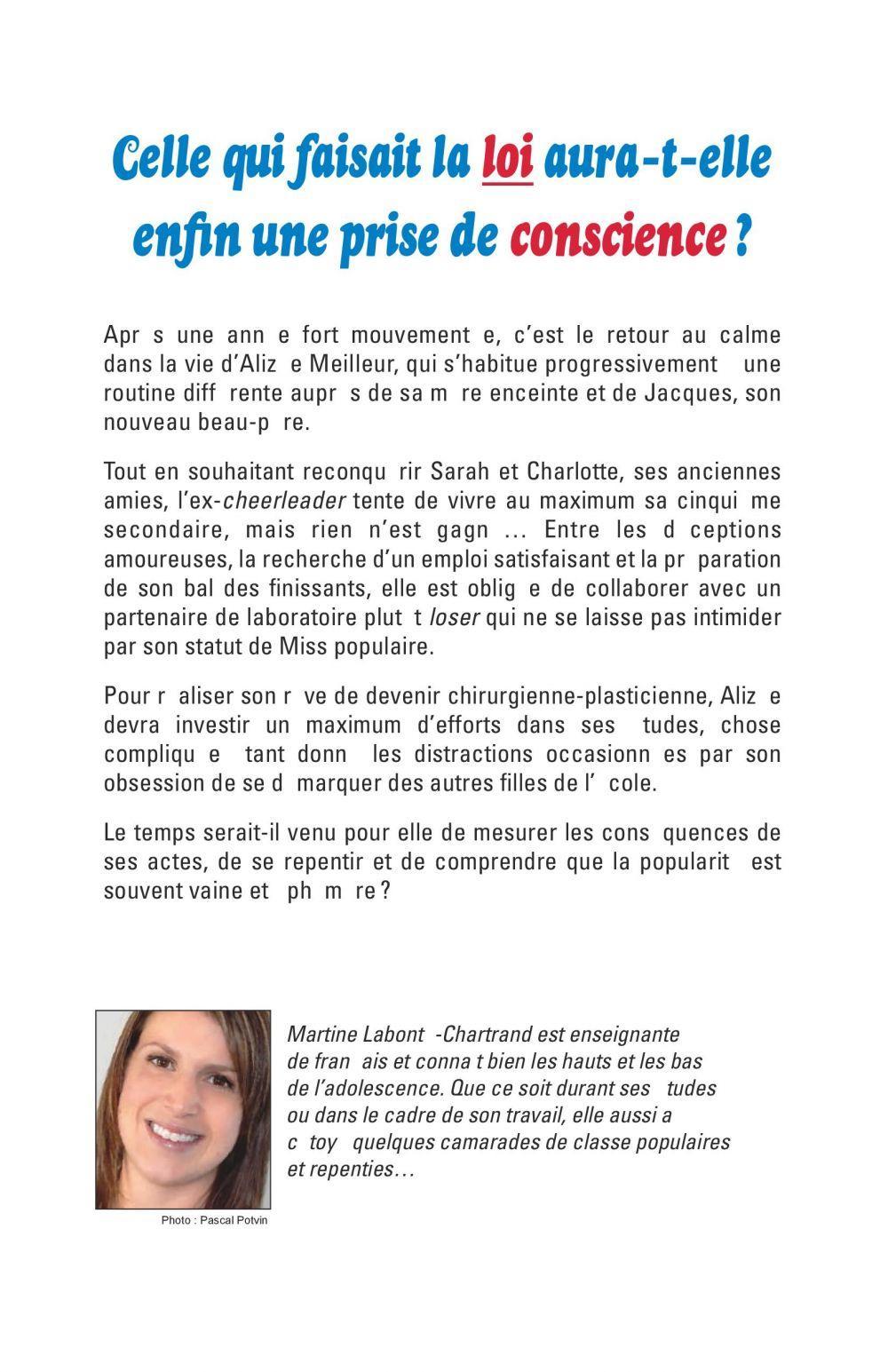 Après une année fort mouvementée, c'est le retour au calme dans la vie d'Alizée Meilleur, qui s'habitue progressivement à une routine différente auprès de sa mère enceinte et de Jacques, son nouveau beau-père.Tout en souhaitant reconquérir Sarah et Charlotte, ses anciennes amies, l'ex-cheerleader tente de vivre au maximum sa cinquième secondaire, mais rien n'est gagné… Entre les déceptions amoureuses, la recherche d'un emploi satisfaisant et la préparation de son bal des finissants, elle est obligée de collaborer avec un partenaire de laboratoire plutôt loser qui ne se laisse pas intimider par son statut de Miss populaire.Pour réaliser son rêve de devenir chirurgienne-plasticienne, Alizée devra investir un maximum d'efforts dans ses études, chose compliquée étant donné les distractions occasionnées par son obsession de se démarquer des autres filles de l'école.Le temps serait-il venu pour elle de mesurer les conséquences de ses actes, de se repentir et de comprendre que la popularité est souvent vaine et éphémère ?