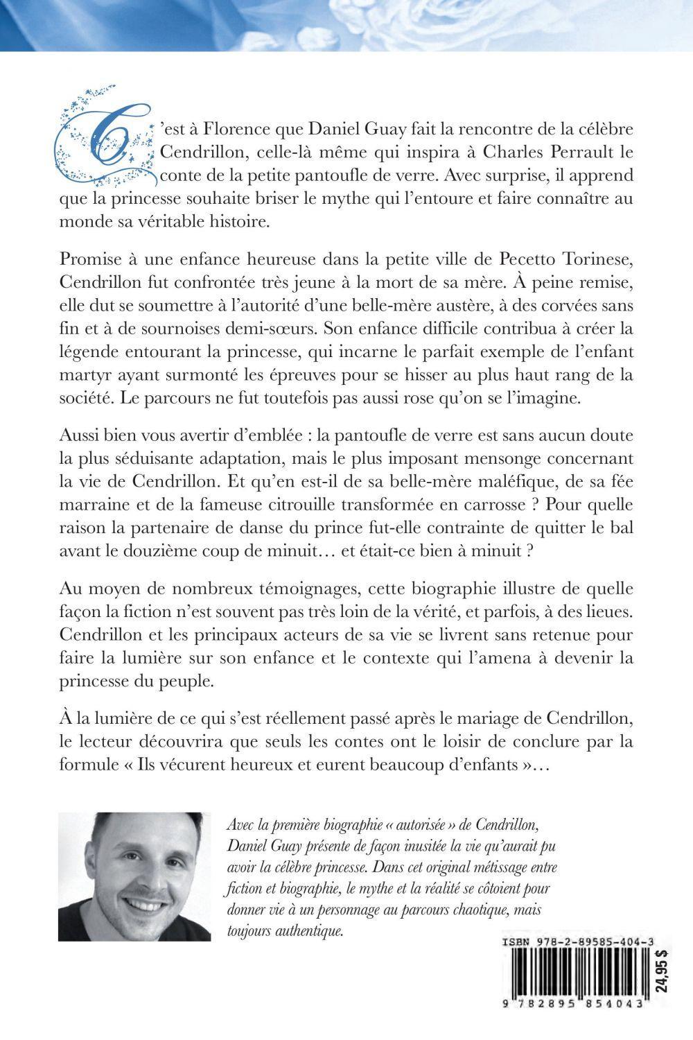 C'est à Florence que Daniel Guay fait la rencontre de la célèbre Cendrillon, celle-là même qui inspira à Charles Perrault le conte de la petite pantoufle de verre. Avec surprise, il apprend que la princesse souhaite briser le mythe qui l'entoure et faire connaître au monde sa véritable histoire.Promise à une enfance heureuse dans la petite ville de Pecetto Torinese, Cendrillon fut confrontée très jeune à la mort de sa mère. A peine remise, elle dut se soumettre à l'autorité d'une belle-mère austère, à des corvées sans fin et à de sournoises demi-soeurs. Son enfance difficile contribua à créer la légende entourant la princesse, qui incarne le parfait exemple de l'enfant martyr ayant surmonté les épreuves pour se hisser au plus haut rang de la société. Le parcours ne fut toutefois pas aussi rose qu'on se l'imagine.Aussi bien vous avertir d'emblée : la pantoufle de verre est sans aucun doute la plus séduisante adaptation, mais le plus imposant mensonge concernant la vie de Cendrillon. Et qu'en est-il de sa belle-mère maléfique, de sa fée marraine et de la fameuse citrouille transformée en carrosse? Pour quelle raison la partenaire de danse du prince fut-elle contrainte de quitter le bal avant le douzième coup de minuit... et était-ce bien à minuit?Au moyen de nombreux témoignages, cette biographie illustre de quelle façon la fiction n'est souvent pas très loin de la vérité, et parfois, à des lieues. Cendrillon et les principaux acteurs de sa vie se livrent sans retenue pour faire la lumière sur son enfance et le contexte qui l'amena à devenir la princesse du peuple.A la lumière de ce qui s'est réellement passé après le mariage de Cendrillon, le lecteur découvrira que seuls les contes ont le loisir de conclure par la formule « Ils vécurent heureux et eurent beaucoup d'enfants» ...