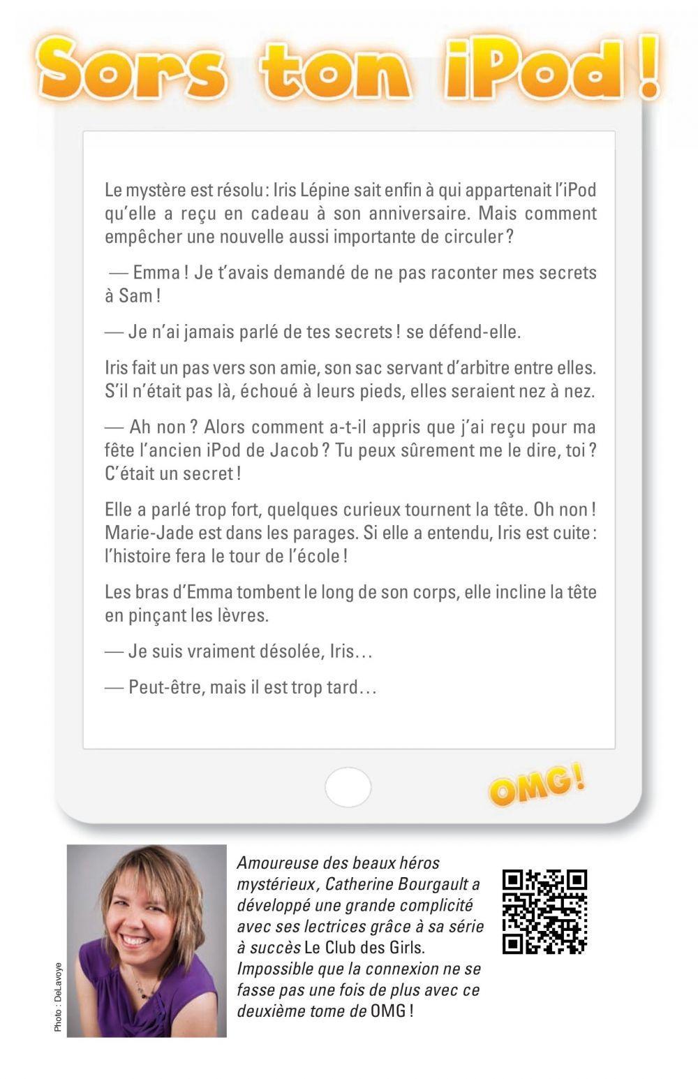 Le mystère est résolu : Iris Lépine sait enfin à qui appartenait l'iPod qu'elle a reçu en cadeau à son anniversaire. Mais comment empêcher une nouvelle aussi importante de circuler ?— Emma ! Je t'avais demandé de ne pas raconter mes secrets à Sam !— Je n'ai jamais parlé de tes secrets ! se défend-elle.Iris fait un pas vers son amie, son sac servant d'arbitre entre elles. S'il n'était pas là, échoué à leurs pieds, elles seraient nez à nez.— Ah non ? Alors comment a-t-il appris que j'ai reçu pour ma fête l'ancien iPod de Jacob ? Tu peux sûrement me le dire, toi ? C'était un secret !Elle a parlé trop fort, quelques curieux tournent la tête. Oh non ! Marie-Jade est dans les parages. Si elle a entendu, Iris est cuite : l'histoire fera le tour de l'école !Les bras d'Emma tombent le long de son corps, elle incline la tête en pinçant les lèvres.— Je suis vraiment désolée, Iris…— Peut-être, mais il est trop tard…