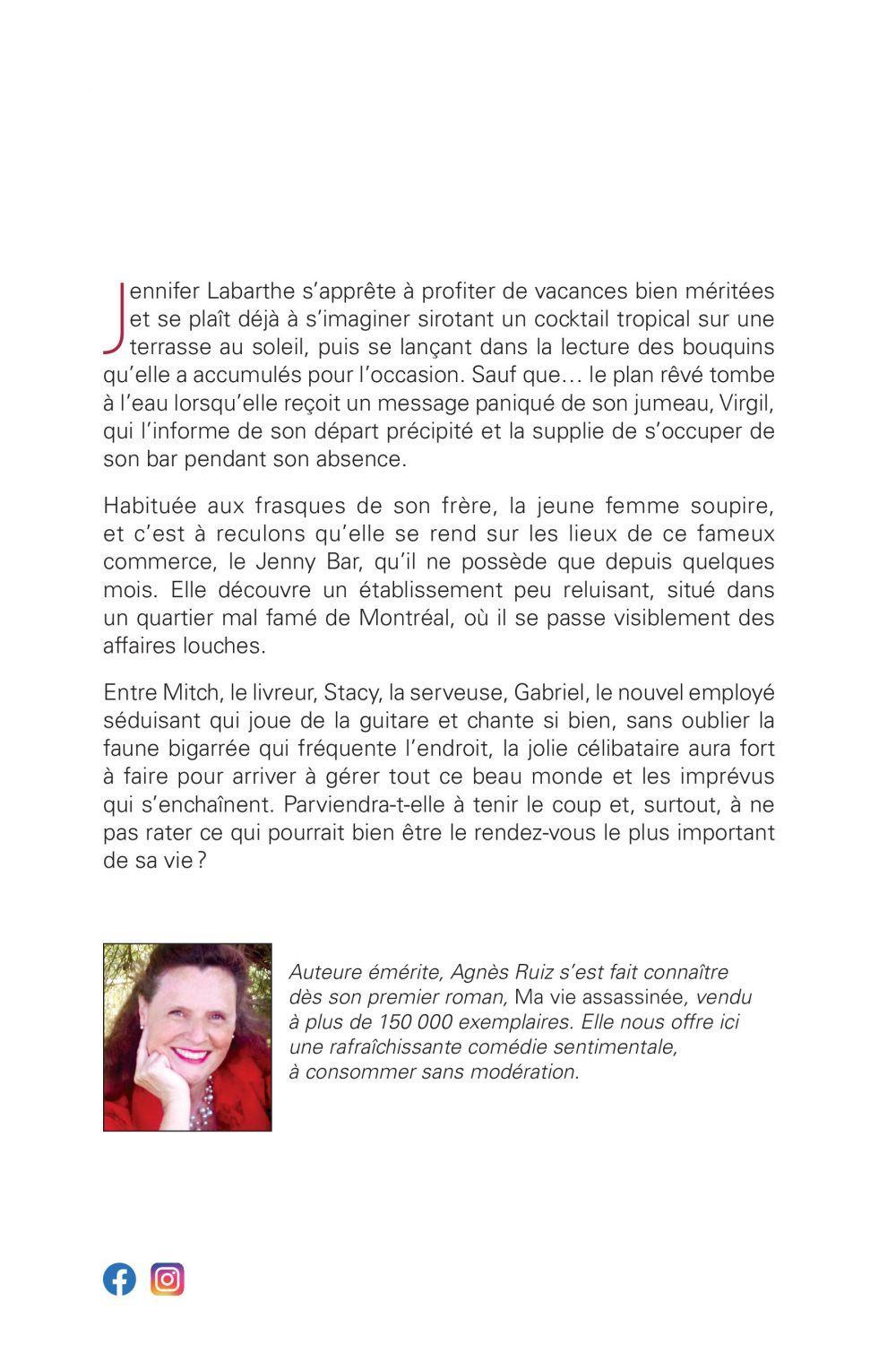 Jennifer s’apprête à profiter de ses vacances et se plaît déjà à s’imaginer sirotant un cocktail au kiwi sur une terrasse de café au soleil, puis à se lancer dans la lecture des bouquins qu’elle vient d’acheter pour l’occasion. Sauf que… le plan rêvé s’écroule lorsqu’elle reçoit sur son répondeur un message paniqué de son jumeau, Virgil, qui l’informe de sondépart précipité et la supplie de s’occuper de son bar pendant son absence. Habituée aux frasques de son frère, la jeune femme soupire et se rend à reculons visiter ce fameux commerce qu’il ne possède que depuis quelques mois. Elle découvre un établissement peu reluisant, situé dans un quartier mal famé de Montréal et n’est pas loin de penser qu’il y a des affaires louches qui s’y passent. Entre Mitch, le livreur, Stacy, la serveuse, le séduisant Gabriel, le nouvel employé qui joue de la guitare et chante si bien, sans oublier la faune bigarrée qui fréquente le bar, la jolie célibataire aura fort à faire pour arriver à gérer tout cebeau monde et les imprévus qui se bousculent à la chaîne. Chose certaine, la broue dans le toupet sera au rendez-vous, et le Jenny Bar ne sera plus jamais le même !