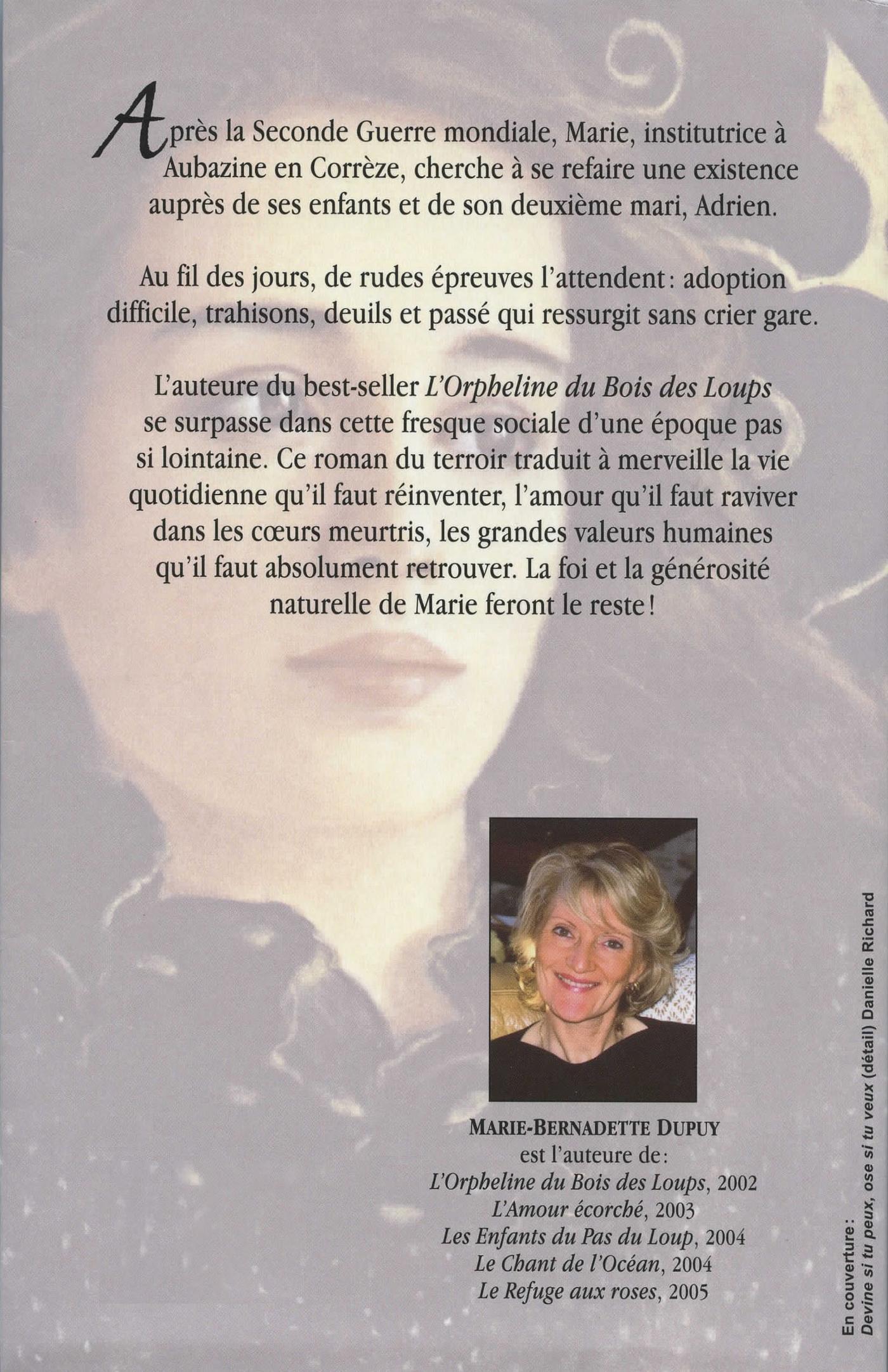 Dans le premier volet intitulé L’Orpheline du Bois des Loups, Marie était une jeune fille élevée par les sœurs à l’orphelinat d’Aubazine, jolie bourgade de Corrèze. Le destin avait voulu qu’elle soit recueillie en 1906, lorsqu’elle avait tout juste treize ans, par une femme à l'air revêche qui l’avait prise à son service. À partir de ce moment, le destin de Marie avait pris un chemin insoupçonné.Dans ce second volet, la petite orpheline est devenue la demoiselle des Bories. La Seconde Guerre mondiale vient de prendre fin. Marie, institutrice à Aubazine, coule des jours paisibles aux côtés de son époux, le docteur Mesnier. Mais de nouvelles épreuves l’attendent: le regard bleu d’une mystérieuse fillette, orpheline elle aussi; la vengeance d’une femme sans scrupules; les hauts et les bas de ses enfants (la sage Lison, Mathilde si passionnée, Paul qui décide de se lancer dans l’élevage, Camille qui rêve d’un amour idéal et souffre en silence).