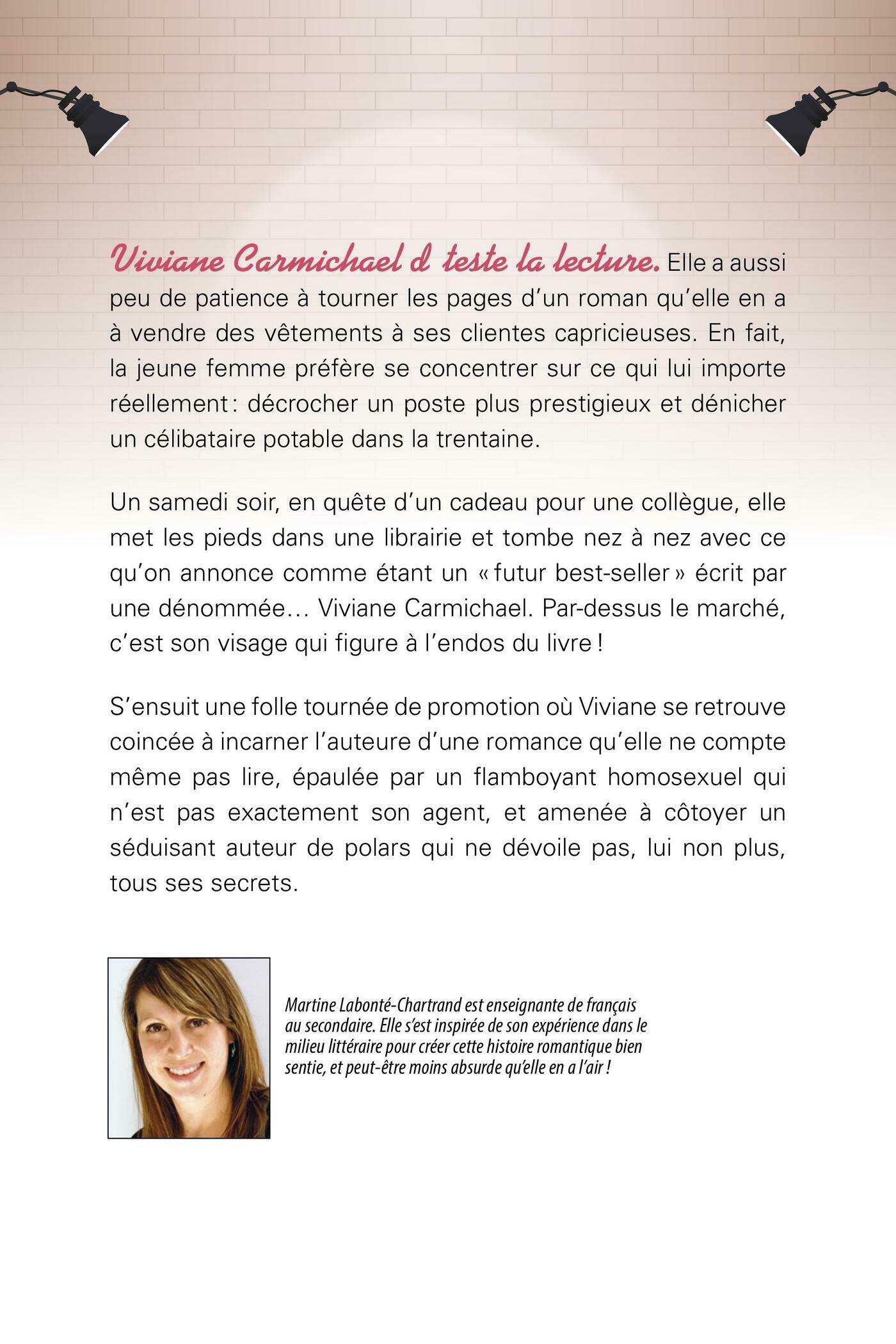 Viviane Carmichael déteste la lecture. Elle a aussi peu de patience à tourner les pages d'un roman qu'elle en a à vendre des vêtements à ses clientes capricieuses. En fait, la jeune femme préfère se concentrer sur ce qui lui importe réellement : décrocher un poste plus prestigieux et dénicher un célibataire potable dans la trentaine.Un samedi soir, en quête d'un cadeau pour une collègue, elle met les pieds dans une librairie et tombe nez à nez avec ce qu'on annonce comme étant un « futur best-seller » écrit par une dénommée… Viviane Carmichael. Par-dessus le marché, c'est son visage qui figure à l'endos du livre !S'ensuit une folle tournée de promotion où Viviane se retrouve coincée à incarner l'auteure d'une romance qu'elle ne compte même pas lire, épaulée par un flamboyant homosexuel qui n'est pas exactement son agent, et amenée à côtoyer un séduisant auteur de polars qui ne dévoile pas, lui non plus, tous ses secrets.