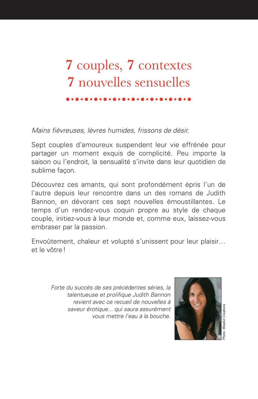 Mains fiévreuses, lèvres humides, frissons de désir.Sept couples d’amoureux suspendent leur vie effrénée pour partager un moment exquis de complicité. Peu importe la saison ou l’endroit, la sensualité s’invite dans leur quotidien de sublime façon.Découvrez ces amants, qui sont profondément épris l’un de l’autre depuis leur rencontre dans un des romans de Judith Bannon, en dévorant ces sept nouvelles émoustillantes. Le temps d’un rendez-vous coquin propre au style de chaque couple, initiez-vous à leur monde et, comme eux, laissez-vous embraser par la passion.Envoûtement, chaleur et volupté s’unissent pour leur plaisir…et le vôtre ! Forte du succès de ses précédentes séries, la talentueuse et prolifique Judith Bannon revient avec ce recueil de nouvelles à saveur érotique... qui saura assurément vous mettre l’eau à la bouche.