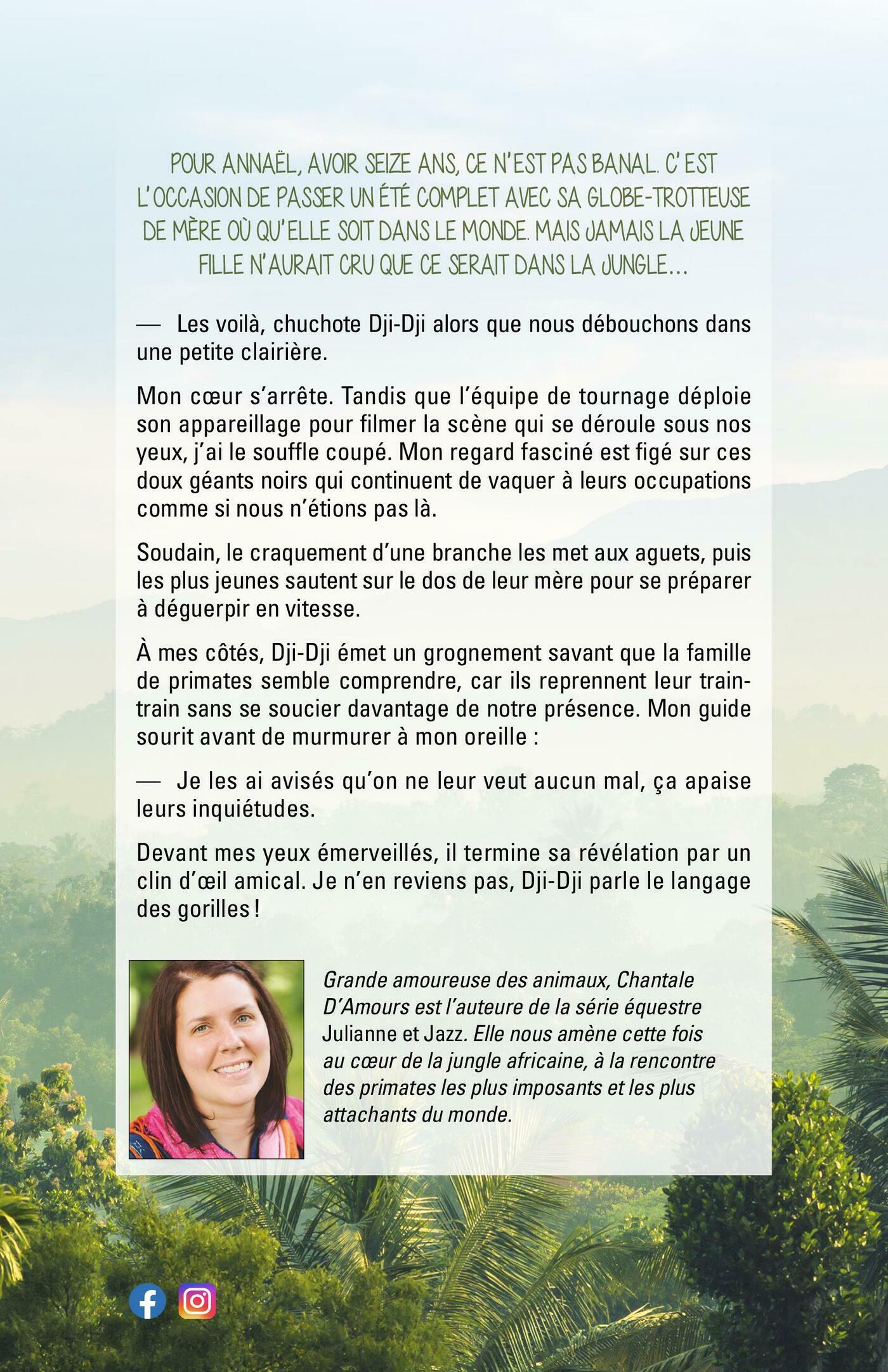 Pour Annaël, avoir seize ans, ce n’est pas banal. C’est l’occasion de passer un été au complet avec sa globe-trotteuse de mère où qu’elle soit dans le monde. Mais jamais la jeune fille n’aurait cru que ce serait dans la jungle…— Les voilà, chuchote Dji-Dji alors que nous débouchons dans une petite clairière. Mon cœur s’arrête. Tandis que l’équipe de tournage déploie son appareillage pour filmer la scène qui se déroule sous nos yeux, j’ai le souffle coupé. Mon regard fasciné est figé sur ces doux géants noirs qui continuent de vaquer à leurs occupations comme si nous n’étions pas là.Soudain, le craquement d’une branche les met aux aguets, puis les plus jeunes sautent sur le dos de leur mère pour se préparer à déguerpir en vitesse.À mes côtés, Dji-Dji émet un grognement savant que la famille de primates semble comprendre, car ils reprennent leur train-train sans se soucier davantage de notre présence. Mon guide sourit avant de murmurer à mon oreille :— Je les ai avisés qu’on ne leur veut aucun mal, ça apaise leurs inquiétudes. Devant mes yeux émerveillés, il termine sa révélation par un clin d’œil amical. Je n’en reviens pas, Dji-Dji parle le langage des gorilles !Grande amoureuse des animaux, Chantale D’Amours est l’auteure de la série équestre Julianne et Jazz. Elle nous amène cette fois au cœur de la jungle africaine, à la rencontre des primates les plus imposants et les plus attachants du monde.