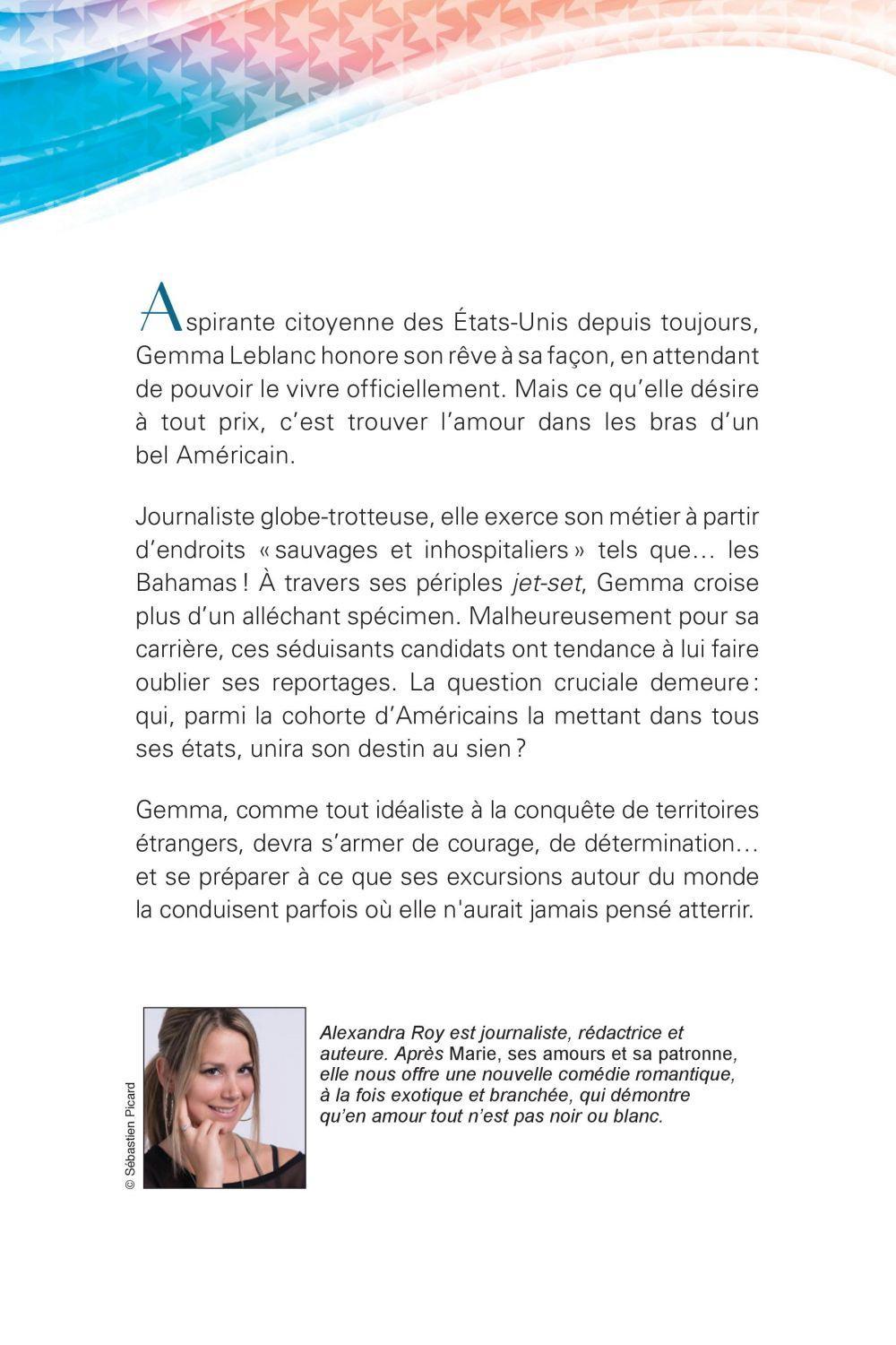 Aspirante citoyenne des Etats-Unis depuis toujours, Gemma Leblanc honore son rêve à sa façon, en attendant de pouvoir le vivre officiellement. Mais ce qu'elle désire à tout prix, c'est trouver l'amour dans les bras d'un bel Américain.Journaliste globe-trotteuse, elle exerce son métier à partir d'endroits « sauvages et inhospitaliers » tels que… les Bahamas ! A travers ses périples jet-set, Gemma croise plus d'un alléchant spécimen. Malheureusement pour sa carrière, ces séduisants candidats ont tendance à lui faire oublier ses reportages. La question cruciale demeure : qui, parmi la cohorte d'Américains la mettant dans tous ses états, unira son destin au sien ?Gemma, comme tout idéaliste à la conquête de territoires étrangers, devra s'armer de courage, de détermination… et se préparer à ce que ses excursions autour du monde la conduisent parfois où elle n'aurait jamais pensé atterrir.