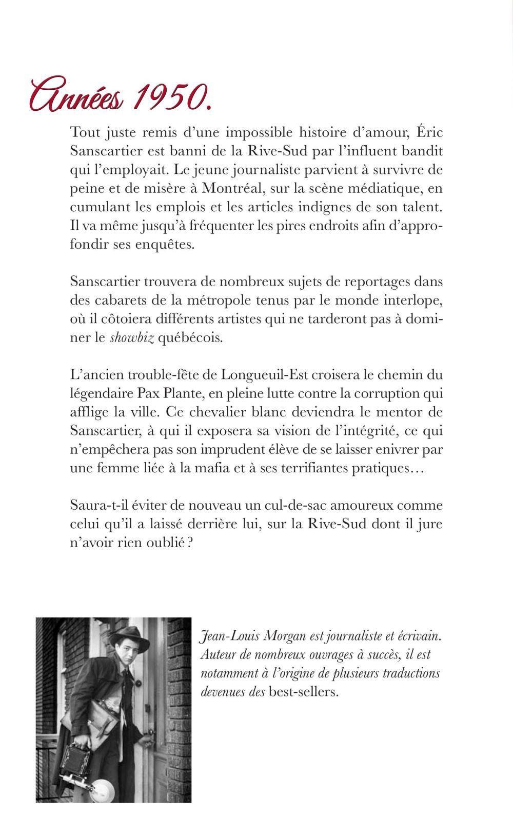 Années 1950. Tout juste remis d'une impossible histoire d'amour, Eric Sanscartier est banni de la Rive-Sud par l'influent bandit qui l'employait. Le jeune journaliste parvient à survivre de peine et de misère à Montréal, sur la scène médiatique, en cumulant les emplois et les articles indignes de talent. Il va même jusqu'à fréquenter les pires endroits afin d'approfondir ses enquêtes.Sanscartier trouvera de nombreux sujets de reportages dans des cabarets de la métropole tenus par le monde interlope, où il côtoiera différents artistes qui ne tarderont pas à dominer le showbiz québécois.L'ancien trouble-fête de Longueuil-Est croisera le chemin du légendaire Pax Plante, en pleine lutte contre la corruption qui afflige la ville. Ce chevalier blanc deviendra le mentor de Sanscartier, à qui il exposera sa vision de l'intégrité, ce qui n'empêchera pas son imprudent élève de se laisser enivrer par une femme liée à la mafia et à ses terrifiantes pratiques…Saura-t-il éviter de nouveau un cul-de-sac amoureux comme celui qu'il a laissé derrière lui, sur la Rive-Sud dont il jure n'avoir rien oublié ?