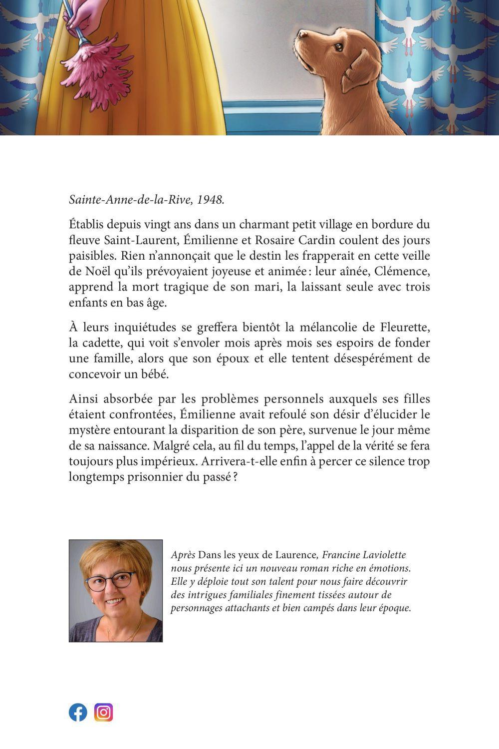 Sainte-Anne-de-la-Rive, 1948. Établis depuis vingt ans dans un charmant petit village en bordure du fleuve Saint-Laurent, Émilienne et Rosaire Cardin coulent des jours paisibles. Rien n’annonçait que le destin les frapperait en cette veille de Noël qu’ils prévoyaient joyeuse et animée : leur aînée, Clémence, apprend la mort tragique de son mari, la laissant seule avec trois enfants en bas âge. À leurs inquiétudes se greffera bientôt la mélancolie de Fleurette, la cadette, qui voit s’envoler mois après mois ses espoirs de fonder une famille, alors que son époux et elle tentent désespérément de concevoir un bébé. Ainsi absorbée par les problèmes personnels auxquels ses filles étaient confrontées, Émilienne avait refoulé son désir d’élucider le mystère entourant la disparition de son père, survenue le jour même de sa naissance. Malgré cela, au fil du temps, l’appel de la vérité se fera toujours plus impérieux. Arrivera-t-elle enfin à percer ce silence trop longtemps prisonnier du passé ?Après Dans les yeux de Laurence, Francine Laviolette nous présente ici un nouveau roman riche en émotions. Elle y déploie tout son talent pour nous faire découvrir des intrigues familiales finement tissées autour de personnages attachants et bien campés dans leur époque.