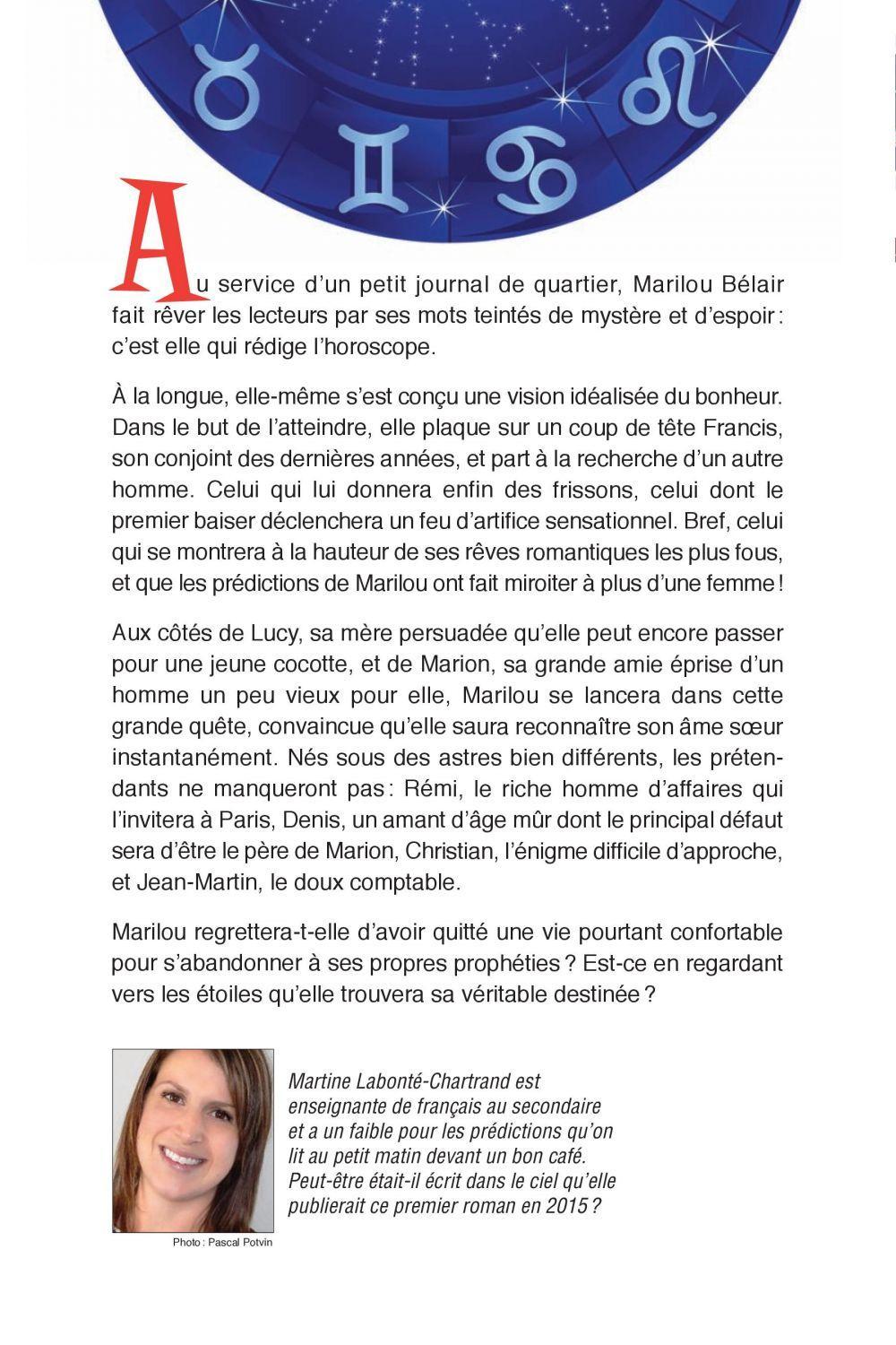 Au service d'un petit journal de quartier, Marilou Bélair fait rêver les lecteurs par ses mots teintés de mystère et d'espoir : c'est elle qui rédige l'horoscope.A la longue, elle-même s'est conçu une vision idéalisée du bonheur. Dans le but de l'atteindre, elle plaque sur un coup de tête Francis, son conjoint des dernières années, et part à la recherche d'un autre homme. Celui qui lui donnera enfin des frissons, celui dont le premier baiser déclenchera un feu d'artifice sensationnel. Bref, celui qui se montrera à la hauteur de ses rêves romantiques les plus fous, et que les prédictions de Marilou ont fait miroiter à plus d'une femme !Aux côtés de Lucy, sa mère persuadée qu'elle peut encore passer pour une jeune cocotte, et de Marion, sa grande amie éprise d'un homme un peu vieux pour elle, Marilou se lancera dans cette grande quête, convaincue qu'elle saura reconnaître son âme soeur instantanément. Nés sous des astres bien différents, les prétendants ne manqueront pas : Rémi, le riche homme d'affaires qui l'invitera à Paris, Denis, un amant d'âge mûr dont le principal défaut sera d'être le père de Marion, Christian, l'énigme difficile d'approche,et Jean-Martin, le doux comptable.Marilou regrettera-t-elle d'avoir quitté une vie pourtant confortable pour s'abandonner à ses propres prophéties ? Est-ce en regardant vers les étoiles qu'elle trouvera sa véritable destinée ?Martine Labonté-Chartrand est enseignante de français au secondaire et a un faible pour les prédictions qu'on lit au petit matin devant un bon café. Peut-être était-il écrit dans le ciel qu'elle publierait ce premier roman en 2015 ?