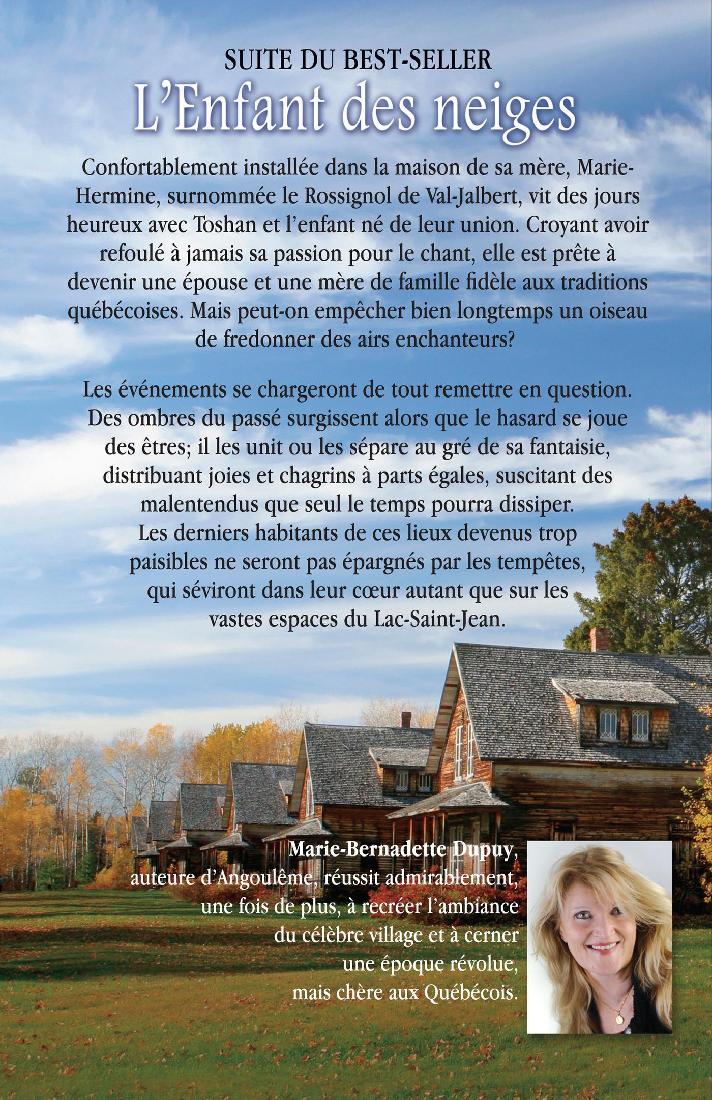 Suite de L’Enfant des neiges, de l’auteure française Marie-Bernadette Dupuy, la vie reprend son cours normal à Val-Jalbert, alors que Toshan, le mari d’Hermine, vient de trouver un emploi à la papeterie de Riverbend. Cependant, cette dernière est toujours possédée par l’envie de chanter et elle décide un matin, sans que personne ne le sache, de passer une audition au Capitole de Québec. Or, le train qu’elle prend à Chambord tombe en panne tout juste avant le sanatorium du lac Édouard, où les voyageurs se réfugient pour la nuit. Pendant le souper, la jeune femme chante pour les patients atteints de tuberculose. Or, l’un d’eux est Jocelyn Chardin, son véritable père. Stupéfait, ce dernier croit reconnaître sa fille, abandonnée au couvent de Val-Jalbert presque deux décennies plus tôt. L’homme condamné par la maladie décide d’en avoir le cœur net et lorsque Hermine revient à Val-Jalbert, déçue par la tournure des événements, il part la retrouver. Jocelyn arrive quelques jours plus tard, incognito, au même moment où sa femme, Laura, annonce qu’elle se marie avec le pianiste Hans Zahle. Secoué, Chardin a tout entendu et retourne discrètement le long de la rivière Péribonka, où il trouve refuge dans la cabane de la mère de Toshan. Tala l’accueille dans sa maison… et dans son lit! Ragaillardi, Chardin repart se présenter à sa femme et sa fille, qui incrédules au départ, doivent reconnaître que c’est bien lui. Bien sûr, le retour du mari prodigue ne fait pas l’affaire de Zahle, qui retourne à Roberval en furie. Une guerre encore plus vive débute entre Jocelyn et Toshan, qui s’amplifie jusqu’à ce que le second sauve la vie du père d’Hermine, alors qu’il se noyait dans le ruisseau Ouellet. Une trêve s’impose et les deux hommes décident de rétablir leur relation sur de nouvelles bases. Mais pendant la période des Fêtes, Toshan découvre que sa mère attend un enfant dont vraisemblablement son beau-père est le géniteur. Mais la décision sans appel d’Hermine de jouer dans un opéra, à Québec, bouscule pour de bon la vie de son entourage à un point tel que l’avenir, qui semble pourtant si prometteur, met en danger le sort de la fragile cellule familiale. La jeune femme au talent exceptionnel se retrouve devant un dilemme implacable : devenir une chanteuse adulée à travers le monde, ou bien une simple mère de famille et épouse attentionnée…