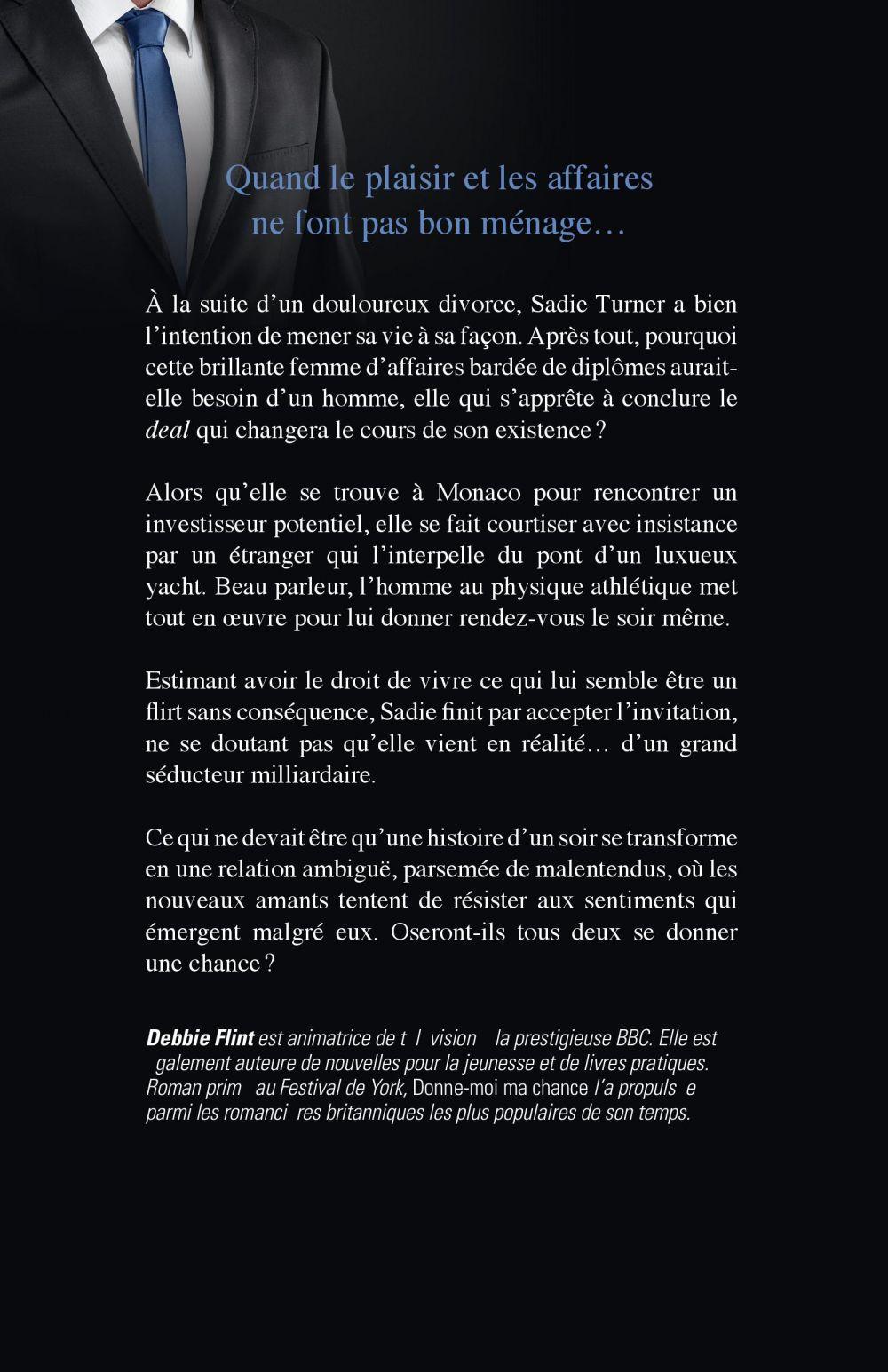 A la suite d'un douloureux divorce, Sadie Turner a bien l'intention de mener sa vie à sa façon. Après tout, pourquoi cette brillante femme d'affaires bardée de diplômes aurait-elle besoin d'un homme, elle qui s'apprête à conclure le deal qui changera le cours de son existence ? Alors qu'elle se trouve à Monaco pour rencontrer un investisseur potentiel, elle se fait courtiser avec insistance par un étranger qui l'interpelle du pont d'un luxueux yacht. Beau parleur, l'homme au physique athlétique met tout en oeuvre pour lui donner rendez-vous le soir même. Estimant avoir le droit de vivre ce qui lui semble être un flirt sans conséquence, Sadie finit par accepter l'invitation, ne se doutant pas qu'elle vient en réalité… d'un grand séducteur milliardaire.Ce qui ne devait être qu'une histoire d'un soir se transforme en une relation ambiguë, parsemée de malentendus, où les nouveaux amants tentent de résister aux sentiments qui émergent malgré eux. Oseront-ils tous deux se donner une chance ?