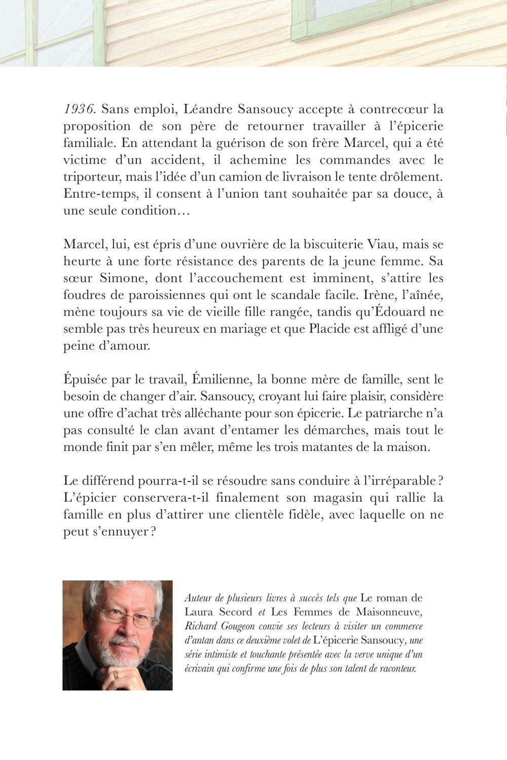 1936. Sans emploi, Léandre Sansoucy accepte à contrecoeur la proposition de son père de retourner travailler à l'épicerie familiale. En attendant la guérison de son frère Marcel, qui a été victime d'un accident, il achemine les commandes avec le triporteur, mais l'idée d'un camion de livraison le tente drôlement. Entre-temps, il consent à l'union tant souhaitée par sa douce, à une seule condition…Marcel, lui, est épris d'une ouvrière de la biscuiterie Viau, mais se heurte à une forte résistance des parents de la jeune femme. Sa soeur Simone, dont l'accouchement est imminent, s'attire les foudres de paroissiennes qui ont le scandale facile. Irène, l'aînée, mène toujours sa vie de vieille fille rangée, tandis qu'Edouard ne semble pas très heureux en mariage et que Placide est affligé d'une peine d'amour.Epuisée par le travail, Emilienne, la bonne mère de famille, sent le besoin de changer d'air. Sansoucy, croyant lui faire plaisir, considère une offre d'achat très alléchante pour son épicerie. Le patriarche n'a pas consulté le clan avant d'entamer les démarches, mais tout le monde finit par s'en mêler, même les trois matantes de la maison.Le différend pourra-t-il se résoudre sans conduire à l'irréparable ? L'épicier conservera-t-il finalement son magasin qui rallie la famille en plus d'attirer une clientèle fidèle, avec laquelle on ne peut s'ennuyer ?
