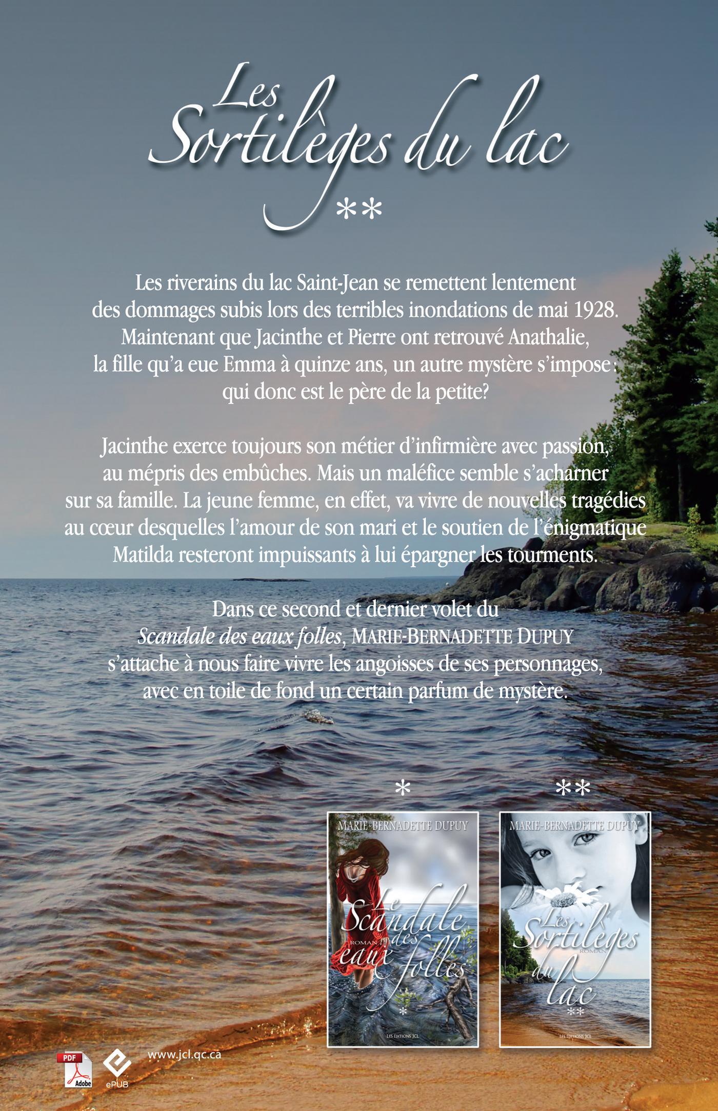 Pays du Lac-Saint-Jean, janvier 1929Jacinthe Cloutier exerce toujours la profession d'infirmière à Saint-Prime, son village natal durement touché par des inondations dévastatrices quelques mois plus tôt. Après avoir sauvé un patient atteint de rage à la suite d'une attaque par un loup, elle découvre qu'il est le frère de la guérisseuse du village, la mystérieuse Mathilda. Une amitié sincère lie les deux femmes, mais lorsque cette dernière assiste Alberta, la mère de Jacinthe, lors de son accouchement, les choses tournent mal. S'enclenche alors une série de drames amoindris par la venue au monde du petit Caleb, qui a survécu à sa mère. Jacinthe n'a d'autre choix que d'abandonner son métier pour en prendre soin. Quatre ans plus tard, ballotés entre l'amour illicite que porte toujours Loric pour sa sœur jumelle, Sidonie, et le délire du simple d'esprit Pacôme, qui voit en Anathalie la réincarnation de sa mère Emma, morte tragiquement dans les folles eaux du lac Saint-Jean en 1928, les membres de la famille Cloutier peinent à trouver la sérénité. Réussiront-ils à enfin à saisir un jour ce bonheur tant attendu?Second et dernier tome d'une série ayant pour cadre les vastes et magnifiques panoramas du Lac-Saint-Jean, ses plaines fertiles et ses forêts boréales denses et giboyeuses, Les Sortilèges du lac clôt admirablement une courte série riche en émotions, en revirements et surtout en passion. C'est évident, Marie-Bernadette Dupuy est encore et toujours au sommet de son art, au grand plaisir de ses centaines de milliers de lectrices et lecteurs à travers le monde.