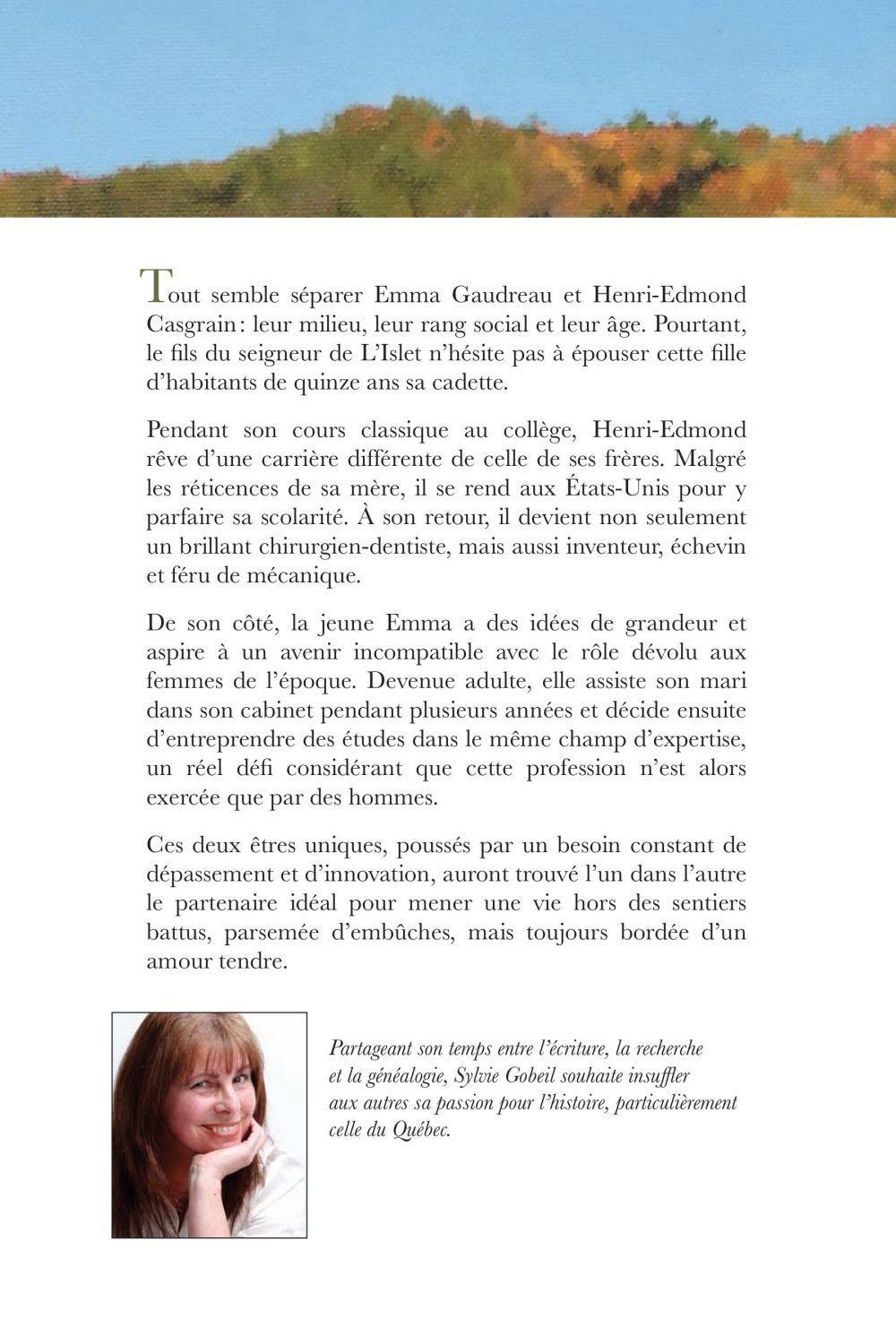 Tout semble séparer Emma Gaudreau et Henri-Edmond Casgrain : leur milieu, leur rang social et leur âge. Pourtant, le fils du seigneur de L'Islet n'hésite pas à épouser cette fille d'habitants de quinze ans sa cadette.Pendant son cours classique au collège, Henri-Edmond rêve d'une carrière différente de celle de ses frères. Malgré les réticences de sa mère, il se rend aux Etats-Unis pour y parfaire sa scolarité. A son retour, il devient non seulement un brillant chirurgien-dentiste, mais aussi inventeur, échevin et féru de mécanique.De son côté, la jeune Emma a des idées de grandeur et aspire à un avenir incompatible avec le rôle dévolu aux femmes de l'époque. Devenue adulte, elle assiste son mari dans son cabinet pendant plusieurs années et décide ensuite d'entreprendre des études dans le même champ d'expertise, un réel défi considérant que cette profession n'est alors exercée que par des hommes.Ces deux êtres uniques, poussés par un besoin constant de dépassement et d'innovation, auront trouvé l'un dans l'autre le partenaire idéal pour mener une vie hors des sentiers battus, parsemée d'embûches, mais toujours bordée d'un amour tendre.A propos de l'auteure :Partageant son temps entre l'écriture, la recherche et la généalogie, Sylvie Gobeil souhaite insuffler aux autres sa passion pour l'histoire, particulièrement celle du Québec.
