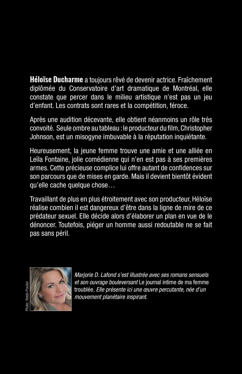 Héloïse Ducharme a toujours rêvé de devenir actrice. Fraîchement diplômée du Conservatoire d’art dramatique de Montréal, elle constate que percer dans le milieu artistique n’est pas un jeu d’enfant. Les contrats sont rares et la compétition, féroce. Après une audition décevante, elle obtient néanmoins un rôle très convoité. Seule ombre au tableau : le producteur du film, Christopher Johnson, est un misogyne imbuvable à la réputation inquiétante.Heureusement, la jeune femme trouve une amie et une alliée en Leïla Fontaine, jolie comédienne qui n’en est pas à ses premières armes. Cette précieuse complice lui offre autant de confidences sur son parcours que de mises en garde. Mais il devient bientôt évident qu’elle cache quelque chose…Travaillant de plus en plus étroitement avec son producteur, Héloïse réalise combien il est dangereux d’être dans la ligne de mire de ce prédateur sexuel. Elle décide alors d’élaborer un plan en vue de le dénoncer. Toutefois, piéger un homme aussi redoutable ne se fait pas sans péril. Marjorie D. Lafond s’est illustrée avec ses romans sensuels et son ouvrage bouleversant Le journal intime de ma femme troublée. Elle présente ici une oeuvre percutante, née d’un mouvement planétaire inspirant.