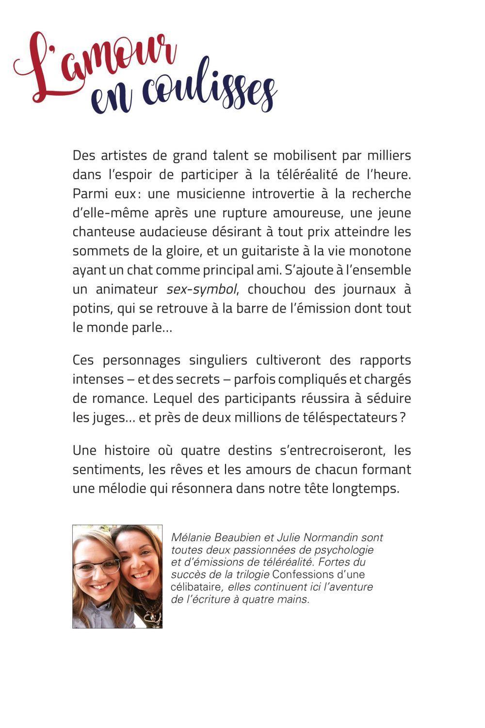 Des artistes de grand talent se mobilisent par milliers dans l'espoir de participer à la téléréalité de l'heure. Parmi eux : une musicienne introvertie à la recherche d'elle-même après une rupture amoureuse, une jeune chanteuse audacieuse désirant à tout prix atteindre les sommets de la gloire, et un guitariste à la vie monotone ayant un chat comme principal ami. S'ajoute à l'ensemble un animateur sex-symbol, chouchou des journaux à potins, qui se retrouve à la barre de l'émission dont tout le monde parle…Ces personnages singuliers cultiveront des rapports intenses – et des secrets – parfois compliqués et chargés de romance. Lequel des participants réussira à séduire les juges… et près de deux millions de téléspectateurs ?Une histoire où quatre destins s'entrecroiseront, les sentiments, les rêves et les amours de chacun formant une mélodie qui résonnera dans notre tête longtemps.A propos des auteures :Mélanie Beaubien et Julie Normandin sont toutes deux passionnées de psychologie et d'émissions de téléréalité. Fortes du succès de la trilogie Confessions d'une célibataire, elles continuent ici l'aventure de l'écriture à quatre mains.