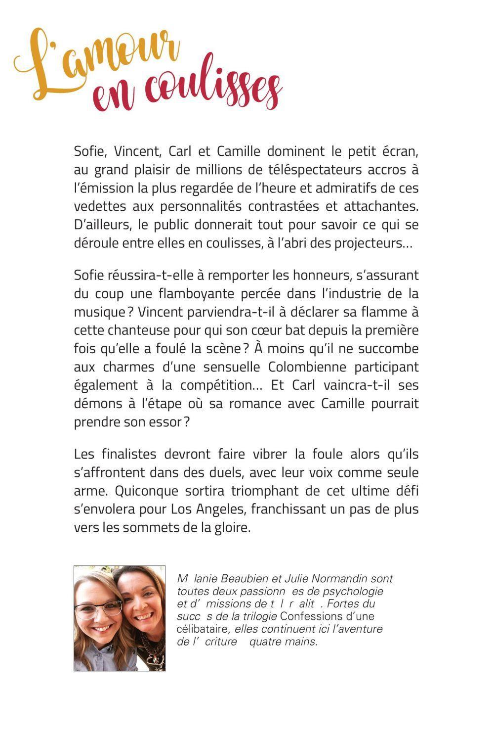 Sofie, Vincent, Carl et Camille dominent le petit écran, au grand plaisir de millions de téléspectateurs accros à l'émission la plus regardée de l'heure et admiratifs de ces vedettes aux personnalités contrastées et attachantes. D'ailleurs, le public donnerait tout pour savoir ce qui se déroule entre elles en coulisses, à l'abri des projecteurs…Sofie réussira-t-elle à remporter les honneurs, s'assurant du coup une flamboyante percée dans l'industrie de la musique ? Vincent parviendra-t-il à déclarer sa flamme à cette chanteuse pour qui son coeur bat depuis la première fois qu'elle a foulé la scène ? A moins qu'il ne succombe aux charmes d'une sensuelle Colombienne participant également à la compétition… Et Carl vaincra-t-il ses démons à l'étape où sa romance avec Camille pourrait prendre son essor ?Les finalistes devront faire vibrer la foule alors qu'ils s'affrontent dans des duels, avec leur voix comme seule arme. Quiconque sortira triomphant de cet ultime défi s'envolera pour Los Angeles, franchissant un pas de plus vers les sommets de la gloire.A propos des auteures :Mélanie Beaubien et Julie Normandin sont toutes deux passionnées de psychologie et d'émissions de téléréalité. Fortes du succès de la trilogie Confessions d'une célibataire, elles continuent ici l'aventure de l'écriture à quatre mains.