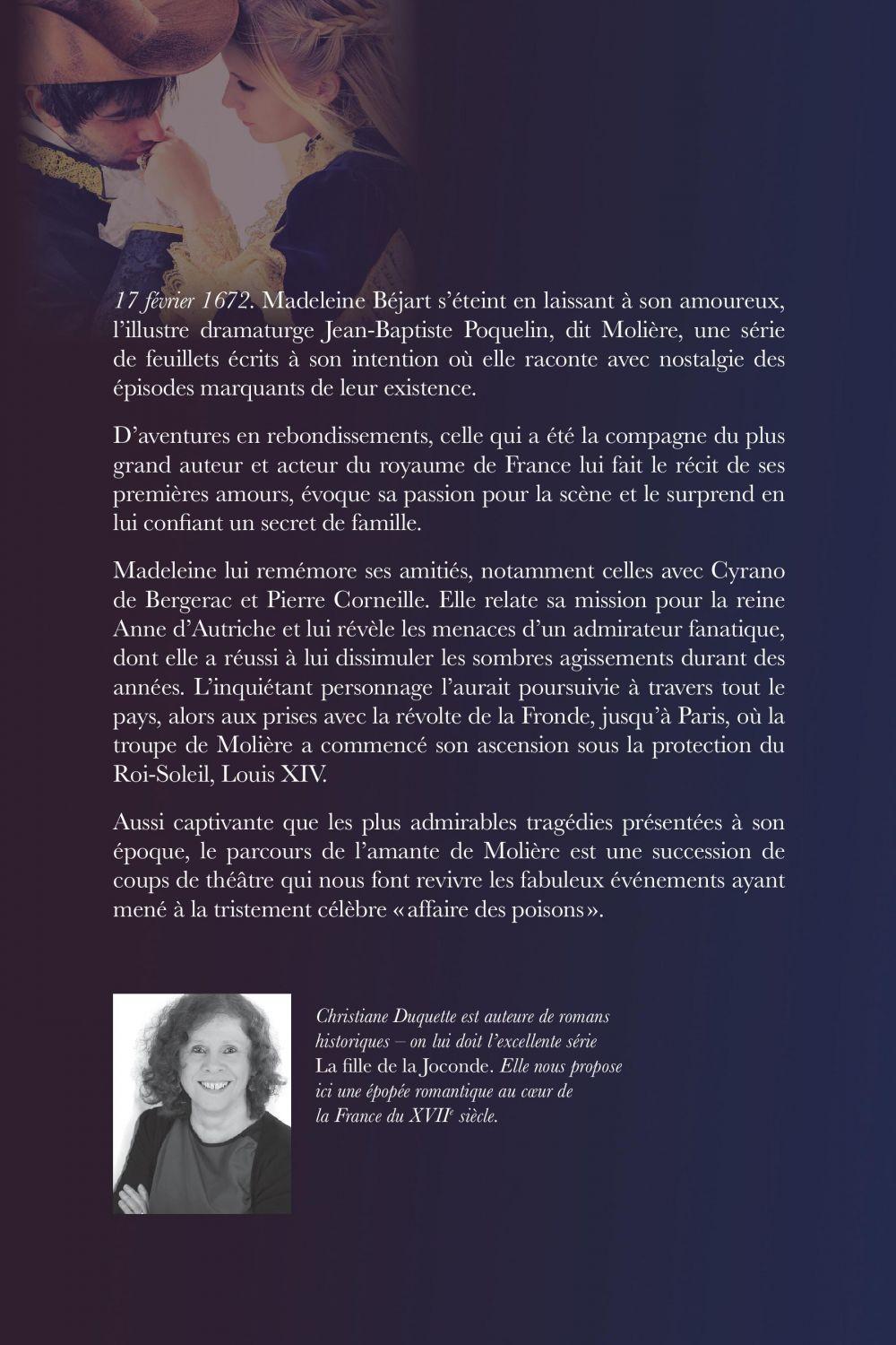 17 février 1672. Madeleine Béjart s'éteint en laissant à son amoureux, l'illustre dramaturge Jean-Baptiste Poquelin, dit Molière, une série de feuillets écrits à son intention où elle raconte avec nostalgie des épisodes marquants de leur existence.D'aventures en rebondissements, celle qui a été la compagne du plus grand auteur et acteur du royaume de France lui fait le récit de ses premières amours, évoque sa passion pour la scène et le surprend en lui confiant un secret de famille.Madeleine lui remémore ses amitiés, notamment celles avec Cyrano de Bergerac et Pierre Corneille. Elle relate sa mission pour la reine Anne d'Autriche et lui révèle les menaces d'un admirateur fanatique, dont elle a réussi à lui dissimuler les sombres agissements durant des années. L'inquiétant personnage l'aurait poursuivie à travers tout le pays, alors aux prises avec la révolte de la Fronde, jusqu'à Paris, où la troupe de Molière a commencé son ascension sous la protection du Roi-Soleil, Louis XIV.Aussi captivante que les plus admirables tragédies présentées à son époque, le parcours de l'amante de Molière est une succession de coups de théâtre qui nous font revivre les fabuleux événements ayant mené à la tristement célèbre « affaire des poisons ».