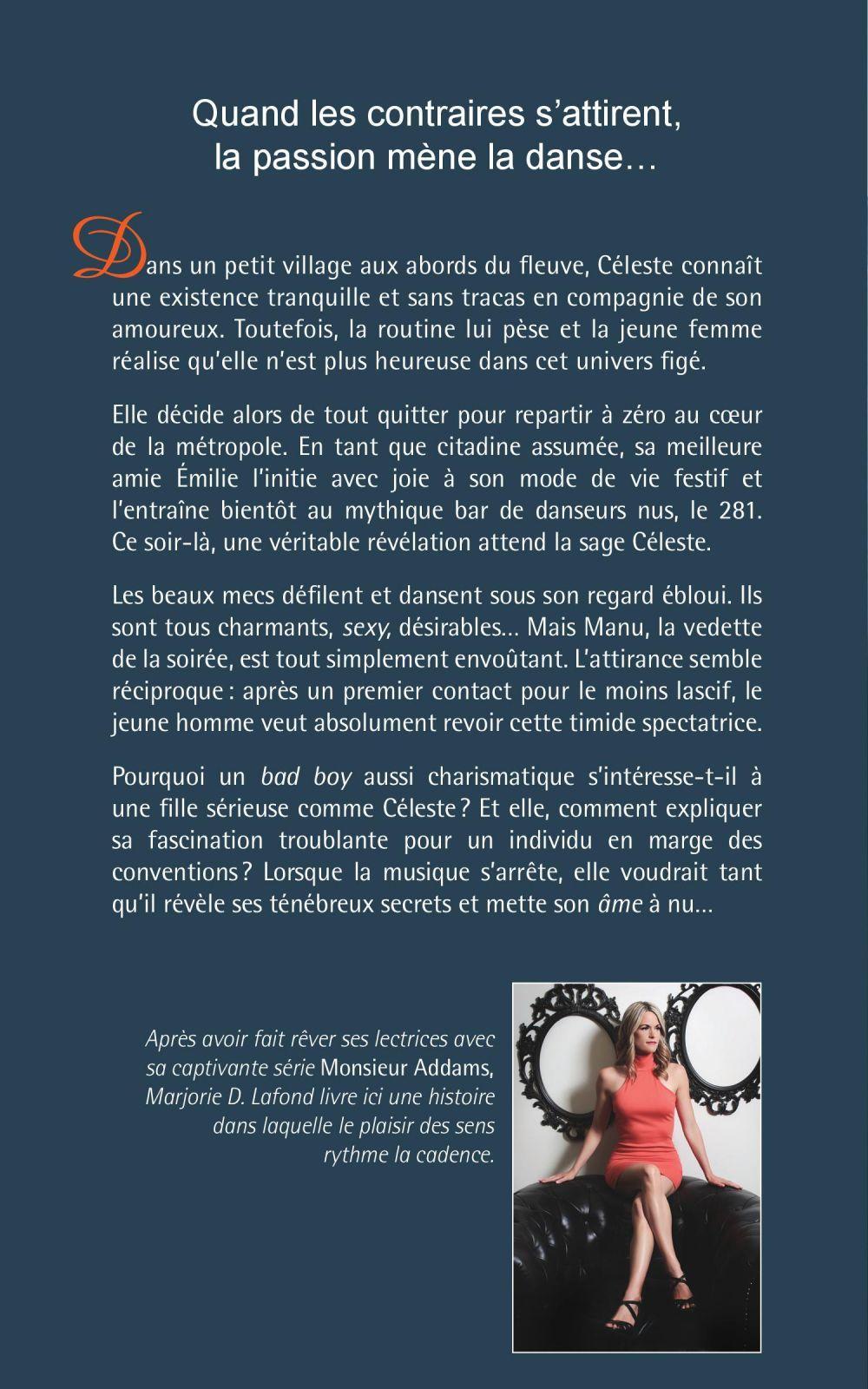 Dans un petit village aux abords du fleuve, Céleste connaît une existence tranquille et sans tracas en compagnie de son amoureux. Toutefois, la routine lui pèse et la jeune femme réalise qu'elle n'est plus heureuse dans cette vie un peu trop bien rangée.Elle décide un jour de tout quitter pour repartir à zéro au coeur de la métropole. En tant que citadine assumée, sa meilleure amie Emilie l'initie avec joie à son mode de vie festif et l'entraîne bientôt au mythique bar de danseurs nus, le 281. Ce soir-là, une véritable révélation attend la sage Céleste.Les hommes défilent et dansent sous son regard ébloui. Ils sont tous beaux, sexy, désirables… Mais Manu, la vedette du spectacle, est tout simplement envoûtant. L'attirance semble réciproque : après un premier contact pour le moins lascif, le jeune homme tient absolument à revoir cette timide spectatrice.Pourquoi un bad boy aussi charismatique s'intéresse-t-il à une fille sérieuse comme Céleste ? Et elle, comment expliquer sa fascination troublante pour un individu en marge des conventions ? Quand la musique s'arrête, elle voudrait tant qu'il révèle ses ténébreux secrets et mette son âme à nu…