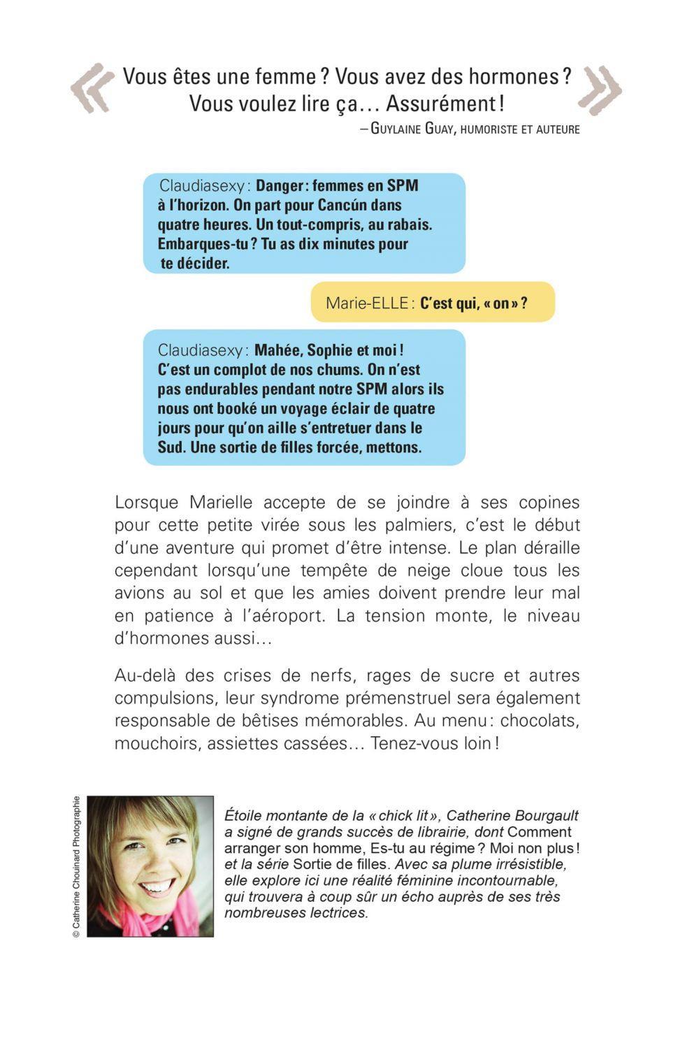 Claudiasexy : Danger : femmes en SPM à l'horizon. On part pour Cancún dans quatre heures. Un tout-compris, au rabais. Embarques-tu ? Tu as dix minutes pour te décider.Marie-ELLE : C'est qui, « on » ?Claudiasexy : Mahée, Sophie et moi ! C'est un complot de nos chums. On n'est pas endurables pendant notre SPM alors ils nous ont booké un voyage éclair de quatre jours pour qu'on aille s'entretuer dans le Sud. Une sortie de filles forcée, mettons.Lorsque Marielle accepte de se joindre à ses copines pour cette petite virée sous les palmiers, c'est le début d'une aventure qui promet d'être intense. Le plan déraille cependant lorsqu'une tempête de neige cloue tous les avions au sol et que les amies doivent prendre leur mal en patience à l'aéroport. La tension monte, le niveau d'hormones aussi…Au-delà des crises de nerfs, rages de sucre et autres compulsions, leur syndrome prémenstruel sera également responsable de bêtises mémorables. Au menu : chocolats, mouchoirs, assiettes cassées… Tenez-vous loin !