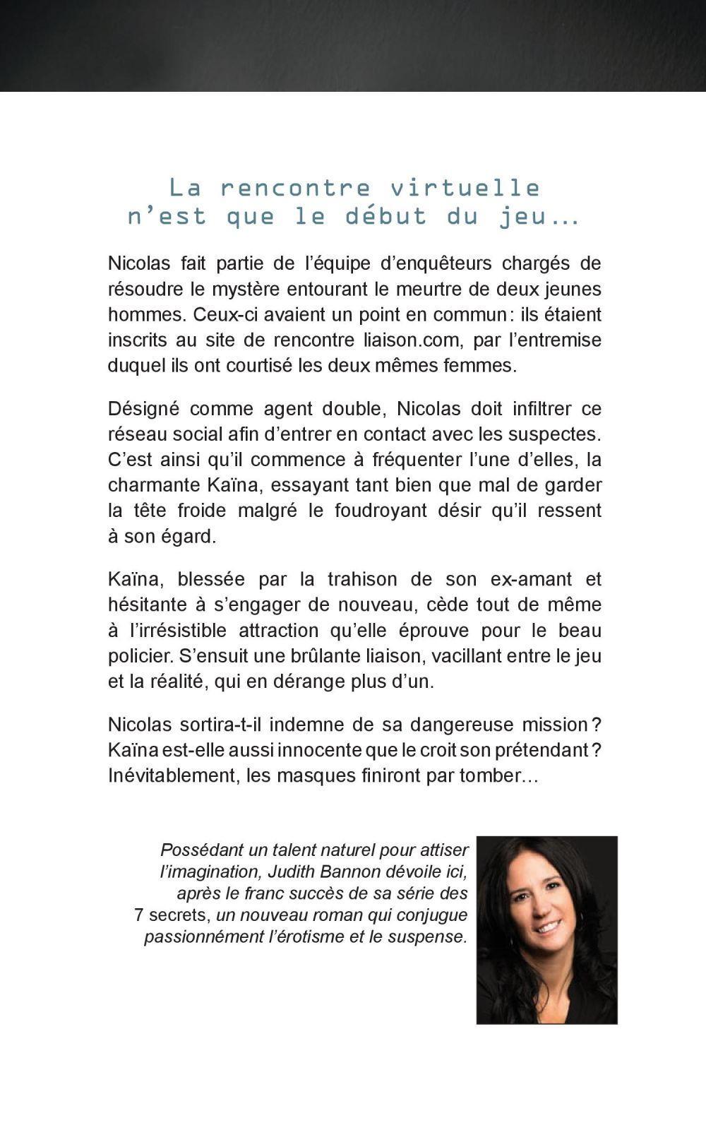 La rencontre virtuelle n'est que le début du jeu...Nicolas fait partie de l'équipe d'enquêteurs chargés de résoudre le mystère entourant le meurtre de deux jeunes hommes. Ceux-ci avaient un point en commun : ils étaient inscrits au site de rencontre liaison.com, par l'entremise duquel ils ont courtisé les deux mêmes femmes.Désigné comme agent double, Nicolas doit infiltrer ce réseau social afin d'entrer en contact avec les suspectes. C'est ainsi qu'il commence à fréquenter l'une d'elles, la charmante Kaïna, essayant tant bien que mal de garder la tête froide malgré le foudroyant désir qu'il ressent à son égard.Kaïna, blessée par la trahison de son ex-amant et hésitante à s'engager de nouveau, cède tout de même à l'irrésistible attraction qu'elle éprouve pour le beau policier. S'ensuit une brûlante liaison, vacillant entre le jeu et la réalité, qui en dérange plus d'un. Nicolas sortira-t-il indemne de sa dangereuse mission ? Kaïna est-elle aussi innocente que le croit son prétendant ? Inévitablement, les masques finiront par tomber…A propos de l'auteure :Possédant un talent naturel pour attiser l'imagination, Judith Bannon dévoile ici, après le franc succès de sa série des 7 secrets, un nouveau roman qui conjugue passionnément l'érotisme et le suspense.