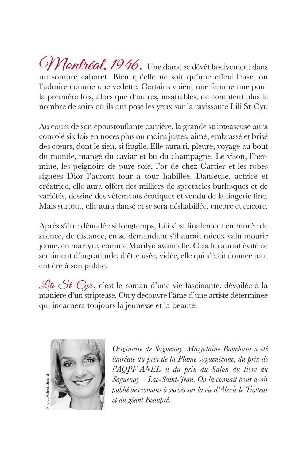 Montréal, 1946. Une dame se dévêt lascivement dans un sombre cabaret. Bien qu'elle ne soit qu'une effeuilleuse, on l'admire comme une vedette. Certains voient une femme nue pour la première fois, alors que d'autres, insatiables, ne comptent plus le nombre de soirs où ils ont posé les yeux sur la ravissante Lili St-Cyr.Au cours de son époustouflante carrière, la grande stripteaseuse aura convolé six fois en noces plus ou moins justes, aimé, embrassé et brisé des coeurs, dont le sien, si fragile. Elle aura ri, pleuré, voyagé au bout du monde, mangé du caviar et bu du champagne. Le vison, l'hermine, les peignoirs de pure soie, l'or de chez Cartier et les robes signées Dior l'auront tour à tour habillée. Danseuse, actrice et créatrice, elle aura offert des milliers de spectacles burlesques et de variétés, dessiné des vêtements érotiques et vendu de la lingerie fine. Mais surtout, elle aura dansé et se sera déshabillée, encore et encore.Après s'être dénudée si longtemps, Lili s'est finalement emmurée de silence, de distance, en se demandant s'il aurait mieux valu mourir jeune, en martyre, comme Marilyn avant elle, Cela lui aurait évité ce sentiment d'ingratitude, d'être usée, vidée, elle qui s'était donnée tout entière à son public.Lili St-Cyr, c'est le roman d'une vie fascinante, dévoilée à la manière d'une stripteaseuse. On y découvre l'âme d'une artiste déterminée qui incarnera toujours la jeunesse et la beauté.