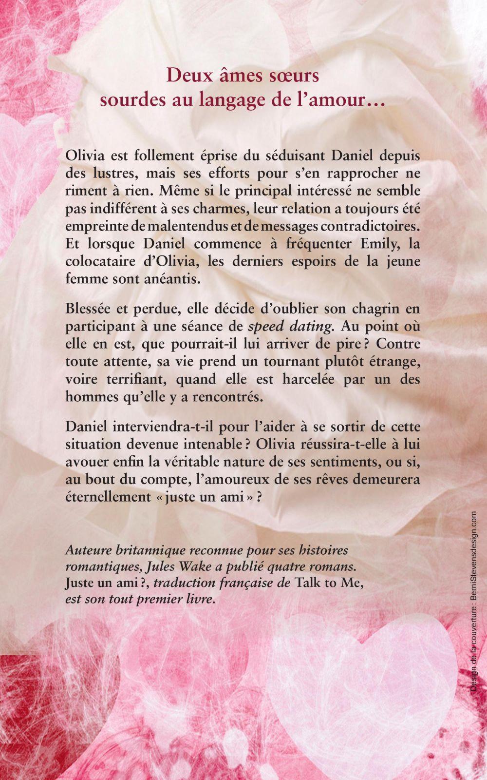 Olivia est follement éprise du séduisant Daniel depuis des lustres, mais ses efforts pour s'en rapprocher ne riment à rien. Même si le principal intéressé ne semble pas indifférent à ses charmes, leur relation a toujours été empreinte de malentendus et de messages contradictoires. Et lorsque Daniel commence à fréquenter Emily, la colocataire d'Olivia, les derniers espoirs de la jeune femme sont anéantis. Blessée et perdue, elle décide d'oublier son chagrin en participant à une séance de speed dating. Au point où elle en est, que pourrait-il lui arriver de pire ? Contre toute attente, sa vie prend un tournant plutôt étrange, voire terrifiant, quand elle est harcelée par un des hommes qu'elle y a rencontrés.Daniel interviendra-t-il pour l'aider à se sortir de cette situation devenue intenable ? Olivia réussira-t-elle à lui avouer enfin la véritable nature de ses sentiments, ou si, au bout du compte, l'amoureux de ses rêves demeurera éternellement « juste un ami » ?