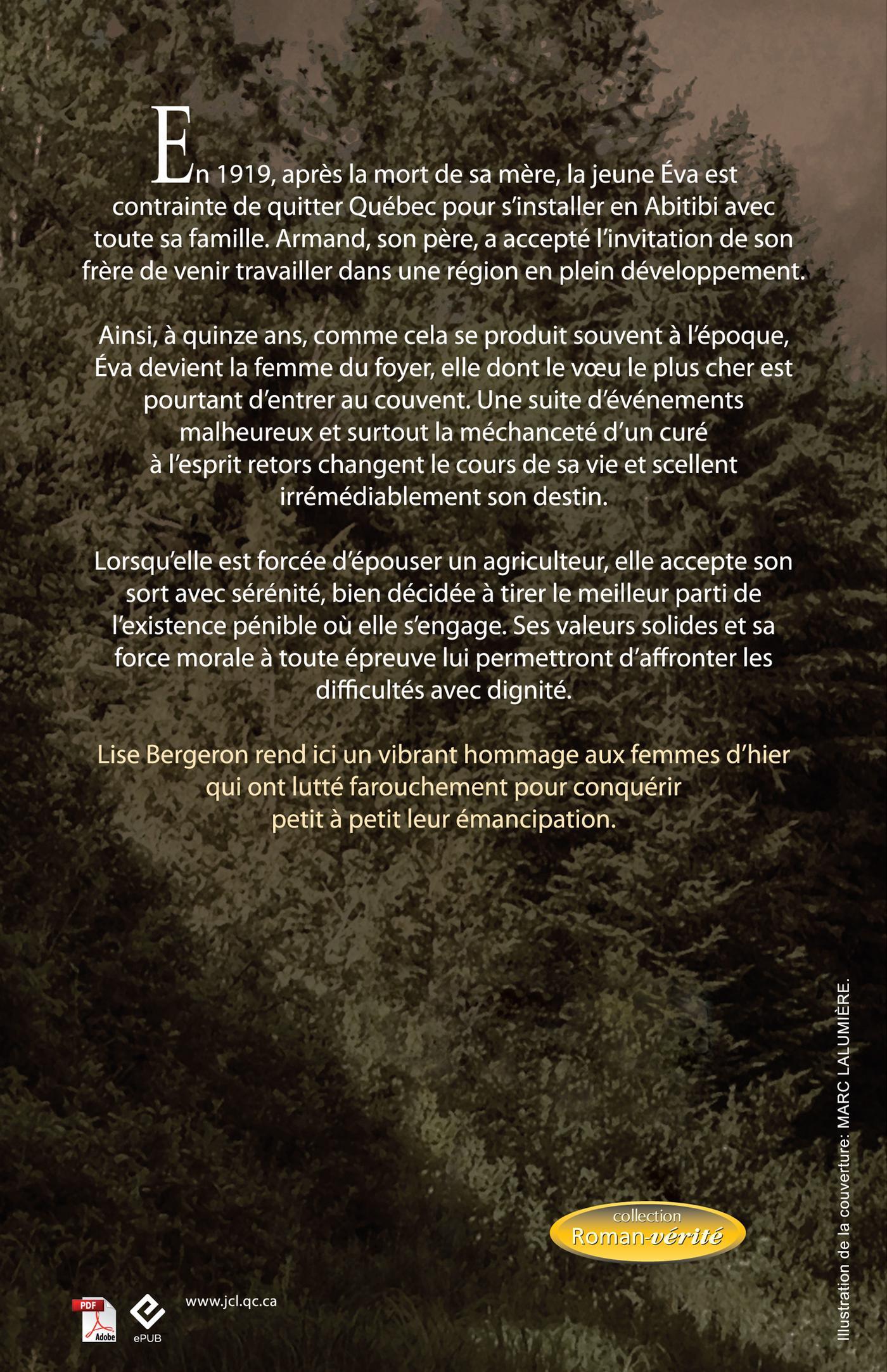 Très affecté par le décès de sa femme survenu lors de la fameuse épidémie de grippe espagnole de 1918, Armand Boisvert reçoit un jour une lettre de son frère Edmond. Ce dernier lui propose de s'installer avec ses quatre enfants à Sainte-Anne-du-Nord, un village agroforestier naissant de l'Abitibi. La plus vieille, Éva, a quinze ans et tente tant bien que mal de remplacer sa défunte mère. Rapidement obligée par le curé de la paroisse de se marier au séduisant, mais taciturne Omer – elle qui voulait pourtant prendre le voile –, Éva devra se transformer peu à peu en une femme forte et fière pour survivre dans cet environnement difficile, voire hostile. Comme toutes les pionnières de cette époque, elle se révélera une femme de devoir, une mère courageuse et une épouse dévouée, et cela, peu importe les malheurs et les tragédies qui s'abattent sur elle ou son entourage. Et au seuil de sa vie, Éva ne regrettera rien, malgré les événements parfois douloureux qui ont pavé sa route. Elle a fait du mieux qu'elle le pouvait, tout ce que son créateur attendait d'elle.