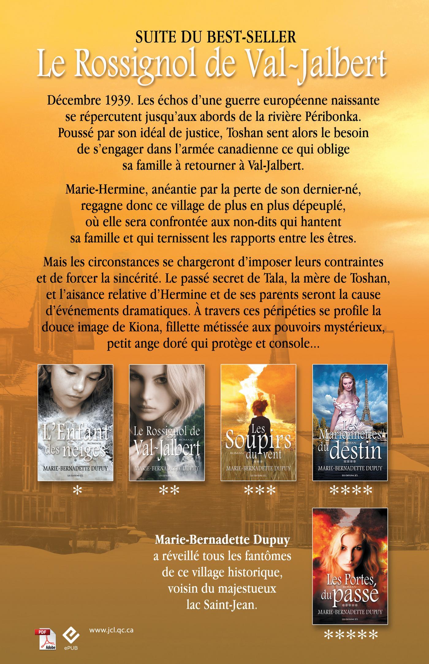 Décembre 1939. Installée dans leur maison au bord de la rivière Péribonka avec son mari et ses enfants, Hermine est en pleine déprime. La talentueuse chanteuse s'en veut d'avoir perdu un enfant, Victor, alors qu'elle faisait tournée par-dessus tournée dans toute l'Amérique du Nord. Et son moral pourtant fragile subit un autre choc lorsque son mari Toshan lui annonce qu'il s'enrôle dans l'armée et part sur-le-champ à la Citadelle de Québec y subir son entraînement. C'en est trop! Devant le dur hiver jeannois qui s'annonce et sans homme pour les protéger, Hermine prend la décision de déménager la petite famille chez ses parents à Val-Jalbert, son cher village fantôme. Parallèlement, elle loue une maison à Roberval où logeront sa belle-mère Tala et la jeune Kiona. Et lorsque la cabane de Tala est incendiée en pleine nuit, par de sombres inconnus, tous partent se réfugier à la hâte au Lac-Saint-Jean, en lieux sûrs. Pourtant, au retour d'une première visite d'Hermine à Roberval, la jeune femme est menacée par des inconnus. Son cheval est alors gravement blessé d'un coup de fusil et elle-même est secourue de justesse par un voisin. Par une série d'indices, Tala comprend alors que ces gens lui veulent du mal pour se venger de la mort d'un homme, tué par son mari, il y a bien longtemps. Comme on s'apprête à fêter Noël et que ses parents ne sont pas là, Hermine décide d'amener Kiona à Val-Jalbert. Quant à Tala, elle part quelques jours en forêt, accompagnée de Madeleine. Or, lorsque Jocelyn et Laura reviennent de Chicoutimi, c'est le drame quand cette dernière aperçoit la jeune Métis. Elle demande à sa fille de la ramener à Roberval, mais Hermine résiste aux crises de sa mère, ce qui donne l'occasion à Jocelyn de faire connaissance de sa fille illégitime. De son côté, en permission pour quelques jours, Toshan revient à Val-Jalbert pendant la période des fêtes. Il assiste avec ses enfants et ses beaux-parents à la messe de Noël où Hermine, comme à son habitude, charme son auditoire par son extraordinaire voix. Mais au cœur de l'hiver, le petit Louis est enlevé par Paul Tremblay, l'homme derrière les événements mettant en cause Tala. Le gredin a flairé la bonne affaire, car il a appris que Laura est riche. C'est la panique à Val-Jalbert et lorsque Hermine apprend la nouvelle à Toshan, ce dernier décide de revenir délivrer son demi-frère. Il arrive au moment où les Chardin reçoivent le téléphone de la maîtresse de Tremblay. La femme, honteuse, a décidé de trahir son amant. Grâce à son aide, Toshan retrouve Louis au fond de la caverne du Trou de la fée, à Desbiens puis repart dans la forêt, où l'armée vient d'ouvrir un camp destiné à garder des prisonniers allemands.Puis au printemps, alors que l'accouchement de Betty vire au drame, Hermine apprend une nouvelle terrible de la bouche même de Simon, qui doit se marier bientôt avec Charlotte. Les épousailles sont compromises, mais le retour soudain de Toshan, qui songe à déserter l'armée, brouille à nouveau les cartes. Est-ce que les deux amoureux trouveront la force d'affronter à nouveau les épreuves qu'ils pressentent?