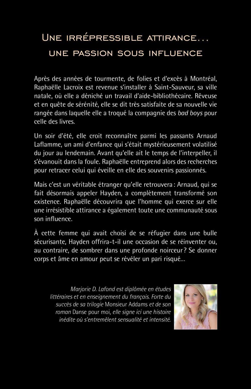 Une irrépressible attirance... une passion sous influenceAprès des années de tourmente, de folies et d'excès à Montréal, Raphaëlle Lacroix est revenue s'installer à Saint-Sauveur, sa ville natale, où elle a déniché un travail d'aide-bibliothécaire. Rêveuse et en quête de sérénité, elle se dit très satisfaite de sa nouvelle vie rangée dans laquelle elle a troqué la compagnie des bad boys pour celle des livres.Un soir d'été, elle croit reconnaître parmi les passants Arnaud Laflamme, un ami d'enfance qui s'était mystérieusement volatilisé du jour au lendemain. Avant qu'elle ait le temps de l'interpeller, il s'évanouit dans la foule. Raphaëlle entreprend alors des recherches pour retracer celui qui éveille en elle des souvenirs passionnés. Mais c'est un véritable étranger qu'elle retrouvera : Arnaud, qui se fait désormais appeler Hayden, a complètement transformé son existence. Raphaëlle découvrira que l'homme qui exerce sur elle une irrésistible attirance a également toute une communauté sous son influence.A cette femme qui avait choisi de se réfugier dans une bulle sécurisante, Hayden offrira-t-il une occasion de se réinventer ou, au contraire, de sombrer dans une profonde noirceur ? Se donner corps et âme en amour peut se révéler un pari risqué…