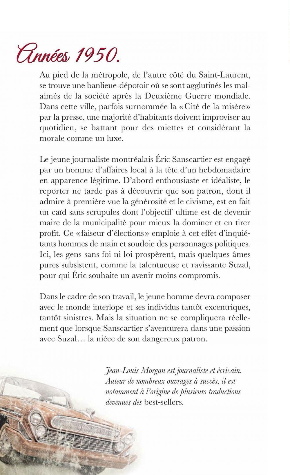 Années 1950. Au pied de la métropole, de l'autre côté du Saint-Laurent, se trouve une banlieue-dépotoir où se sont agglutinés les mal-aimés dela société après la Deuxième Guerre mondiale. Dans cette ville, parfois surnommée la « Cité de la misère » par la presse, une majorité d'habitantsdoivent improviser au quotidien, se battant pour des miettes et considérant la morale comme un luxe.Le jeune journaliste montréalais Eric Sanscartier est engagé par un homme d'affaires local à la tête d'un hebdomadaire en apparence légitime. D'abord enthousiaste et idéaliste, le reporter ne tarde pas àdécouvrir que son patron, dont il admire à première vue la générosité et le civisme, est en fait un caïd sans scrupules dont l'objectif ultime est de devenir maire de la municipalité pour mieux la dominer et en tirer profit. Ce « faiseur d'élections » emploie à cet effet d'inquiétants hommes de main et soudoie des personnages politiques. Ici, les gens sans foi ni loi prospèrent, mais quelques âmes pures subsistent, comme la talentueuse et ravissante Suzal, pour qui Eric souhaite un avenir moins compromis. Dans le cadre de son travail, le jeune homme devra composer avec le monde interlope et ses individus tantôt excentriques, tantôt sinistres.Mais la situation ne se compliquera réellement que lorsque Sanscartier s'aventurera dans une passion avec Suzal… la nièce de son dangereux patron.