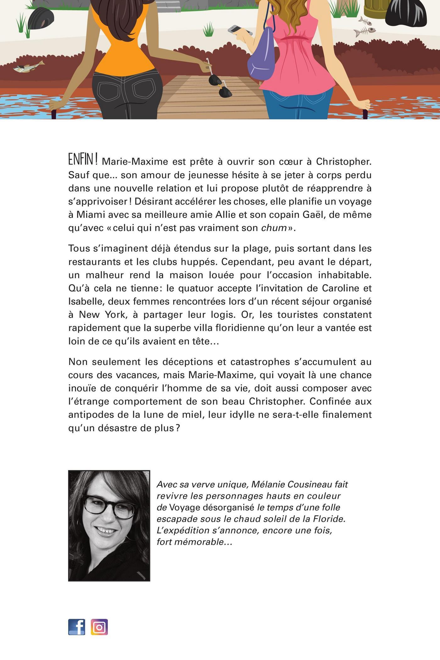 ENFIN ! Marie-Maxime est prête à ouvrir son cœur à Christopher. Sauf que... son amour de jeunesse hésite à se jeter à corps perdu dans une nouvelle relation et lui propose plutôt de réapprendre à s’apprivoiser ! Désirant accélérer les choses, elle planifie un voyage à Miami avec sa meilleure amie Allie et son copain Gaël, de même qu’avec « celui qui n’est pas vraiment son chum ».Tous s’imaginent déjà étendus sur la plage, puis sortant dans les restaurants et les clubs huppés. Cependant, peu avant le départ, un malheur rend la maison louée pour l’occasion inhabitable. Qu’à cela ne tienne : le quatuor accepte l’invitation de Caroline et Isabelle, deux femmes rencontrées lors d’un récent séjour organisé à New York, à partager leur logis. Or, les touristes constatent rapidement que la superbe villa floridienne qu’on leur a vantée est loin de ce qu’ils avaient en tête…Non seulement les déceptions et catastrophes s’accumulent au cours des vacances, mais Marie-Maxime, qui voyait là une chance inouïe de conquérir l’homme de sa vie, doit aussi composer avec l’étrange comportement de son beau Christopher. Confinée aux antipodes de la lune de miel, leur idylle ne sera-t-elle finalement qu’un désastre de plus ?Avec sa verve unique, Mélanie Cousineau fait revivre les personnages hauts en couleur de Voyage désorganisé le temps d’une folle escapade sous le chaud soleil de la Floride. L’expédition s’annonce, encore une fois, fort mémorable…