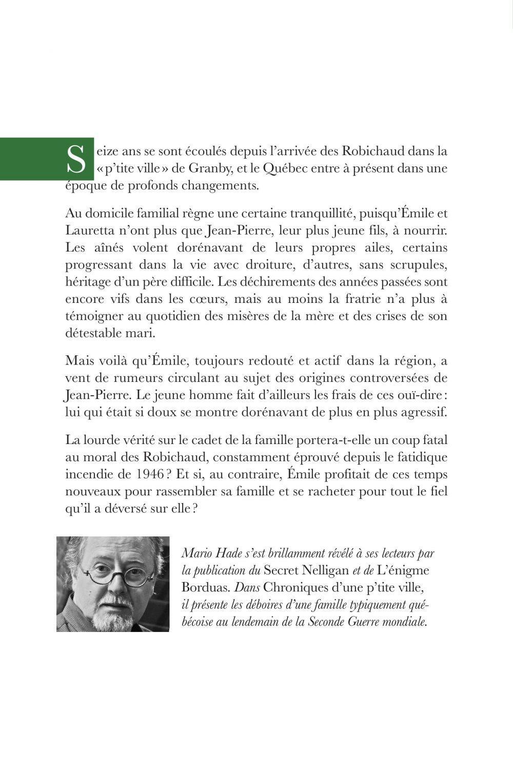"Seize ans se sont écoulés depuis l'arrivée des Robichaud dans la « p'tite ville » de Granby, et le Québec entre à présent dans une époque de profonds changements.Au domicile familial règne une certaine tranquillité, puisqu'Emile et Lauretta n'ont plus que Jean-Pierre, leur plus jeune fils, à nourrir. Les aînés volent dorénavant de leurs propres ailes, certains progressant dans la vie avec droiture, d'autres, sans scrupules, héritage d'un père difficile. Les déchirements des années passées sont encore vifs dans les coeurs, mais au moins la fratrie n'a plus à témoigner au quotidien des misères de la mère et des crises de son détestable mari.Mais voilà qu'Emile, toujours redouté et actif dans la région, a vent de rumeurs circulant au sujet des origines controversées de Jean-Pierre. Le jeune homme fait d'ailleurs les frais de ces ouï-dire : lui qui était si doux se montre dorénavant de plus en plus agressif.La lourde vérité sur le cadet de la famille portera-t-elle un coup fatal au moral des Robichaud, constamment éprouvé depuis le fatidique incendie de 1946 ? Et si, au contraire, Emile profitait de ces temps nouveaux pour rassembler sa famille et se racheter pour tout le fiel qu'il a déversé sur elle ?Mario Hade s'est brillamment révélé à ses lecteurs par la publication du Secret Nelligan et de L'énigme Borduas. Dans Chroniques d'une p'tite ville, il présente les déboires d'une famille typiquement québécoise au lendemain de la Seconde Guerre mondiale."