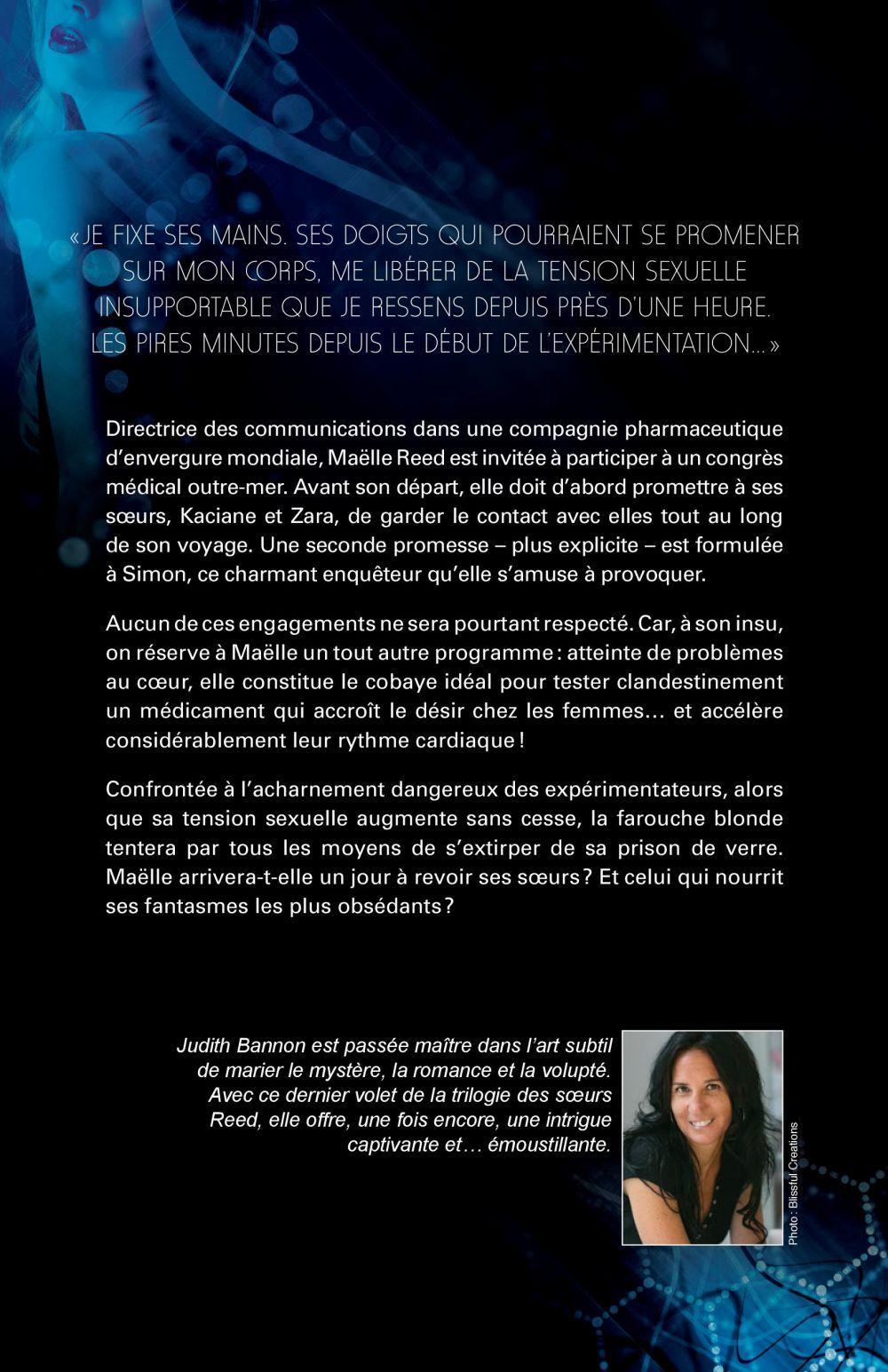 Directrice des communications dans une compagnie pharmaceutique d'envergure mondiale, Maëlle Reed est invitée à participer à un congrès médical outre-mer. Avant son départ, elle doit d'abord promettre à ses soeurs, Kaciane et Zara, de garder le contact avec elles tout au long de son voyage. Une seconde promesse – plus explicite – est formulée à Simon, ce charmant enquêteur qu'elle s'amuse à provoquer.Aucun de ces engagements ne sera pourtant respecté. Car, à son insu, on réserve à Maëlle un tout autre programme : atteinte de problèmes au coeur, elle constitue le cobaye idéal pour tester clandestinement un médicament qui accroît le désir chez les femmes… et accélère considérablement leur rythme cardiaque !Confrontée à l'acharnement dangereux des expérimentateurs, alors que sa tension sexuelle augmente sans cesse, la farouche blonde tentera par tous les moyens de s'extirper de sa prison de verre. Maëlle arrivera-t-elle un jour à revoir ses soeurs ? Et celui qui nourrit ses fantasmes les plus obsédants ?