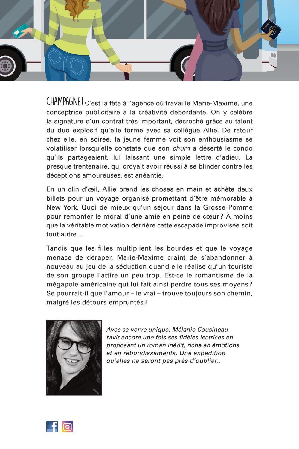 Champagne ! C’est la fête à l’agence où travaille Marie-Maxime, une conceptrice publicitaire à la créativité débordante. On y célèbre la signature d’un contrat très important, décroché grâce au talent du duo explosif qu’elle forme avec sa collègue Allie. De retour chez elle, en soirée, la jeune femme voit son enthousiasme se volatiliser lorsqu’elle constate que son chum a déserté le condo qu’ils partageaient, lui laissant une simple lettre d’adieu. La presque trentenaire, qui croyait avoir réussi à se blinder contre les déceptions amoureuses, est anéantie.En un clin d’oeil, Allie prend les choses en main et achète deux billets pour un voyage organisé promettant d’être mémorable à New York. Quoi de mieux qu’un séjour dans la Grosse Pomme pour remonter le moral d’une amie en peine de coeur ? À moins que la véritable motivation derrière cette escapade improvisée soit tout autre…Tandis que les filles multiplient les bourdes et que le voyage menace de déraper, Marie-Maxime craint de s’abandonner à nouveau au jeu de la séduction quand elle réalise qu’un touriste de son groupe l’attire un peu trop. Est-ce le romantisme de la mégapole américaine qui lui fait ainsi perdre tous ses moyens ? Se pourrait-il que l’amour – le vrai – trouve toujours son chemin, malgré les détours empruntés ?Avec sa verve unique, Mélanie Cousineau ravit encore une fois ses fidèles lectrices en proposant un roman inédit, riche en émotions et en rebondissements. Une expédition qu’elles ne seront pas près d’oublier…