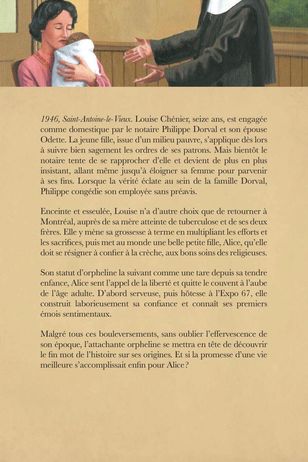 1946, Saint-Antoine-le-Vieux. Louise Chénier, seize ans, est engagée comme domestique par le notaire Philippe Dorval et son épouse Odette. La jeune fille, issue d'un milieu pauvre, s'applique dès lors à suivre bien sagement les ordres de ses patrons. Mais bientôt le notaire tente de se rapprocher d'elle et devient de plus en plus insistant, allant même jusqu'à éloigner sa femme pour parvenir à ses fins. Lorsque la vérité éclate au sein de la famille Dorval, Philippe congédie son employée sans préavis.Enceinte et esseulée, Louise n'a d'autre choix que de retourner à Montréal, auprès de sa mère atteinte de tuberculose et de ses deux frères. Elle y mène sa grossesse à terme en multipliant les efforts et les sacrifices, puis met au monde une belle petite fille, Alice, qu'elle doit se résigner à confier à la crèche, aux bons soins des religieuses.Son statut d'orpheline la suivant comme une tare depuis sa tendre enfance, Alice sent l'appel de la liberté et quitte le couvent à l'aube de l'âge adulte. D'abord serveuse, puis hôtesse à l'Expo 67, elle construit laborieusement sa confiance et connaît ses premiers émois sentimentaux.Malgré tous ces bouleversements, sans oublier l'effervescence de son époque, l'attachante orpheline se mettra en tête de découvrir le fin mot de l'histoire sur ses origines. Et si la promesse d'une vie meilleure s'accomplissait enfin pour Alice ?