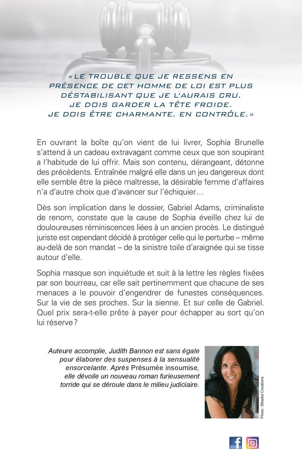 « Le trouble que je ressens en présence de cet homme de loi est plus déstabilisant que je l’aurais cru. Je dois garder la tête froide. Je dois être charmante. En contrôle. »En ouvrant la boîte qu’on vient de lui livrer, Sophia Brunelle s’attend à un cadeau extravagant comme ceux que son soupirant a l’habitude de lui offrir. Mais son contenu, dérangeant, détonne des précédents. Entraînée malgré elle dans un jeu dangereux dont elle semble être la pièce maîtresse, la désirable femme d’affaires n’a d’autre choix que d’avancer sur l’échiquier… Dès son implication dans le dossier, Gabriel Adams, criminaliste de renom, constate que la cause de Sophia éveille chez lui de douloureuses réminiscences liées à un ancien procès. Le distingué juriste est cependant décidé à protéger celle qui le perturbe – même au-delà de son mandat – de la sinistre toile d’araignée qui se tisse autour d’elle. Sophia masque son inquiétude et suit à la lettre les règles fixées par son bourreau, car elle sait pertinemment que chacune de ses menaces a le pouvoir d’engendrer de funestes conséquences. Sur la vie de ses proches. Sur la sienne. Et sur celle de Gabriel. Quel prix sera-t-elle prête à payer pour échapper au sort qu’on lui réserve ? Auteure accomplie, Judith Bannon est sans égale pour élaborer des suspenses à la sensualité ensorcelante. Après Présumée insoumise, elle dévoile un nouveau roman furieusement torride qui se déroule dans le milieu judiciaire.