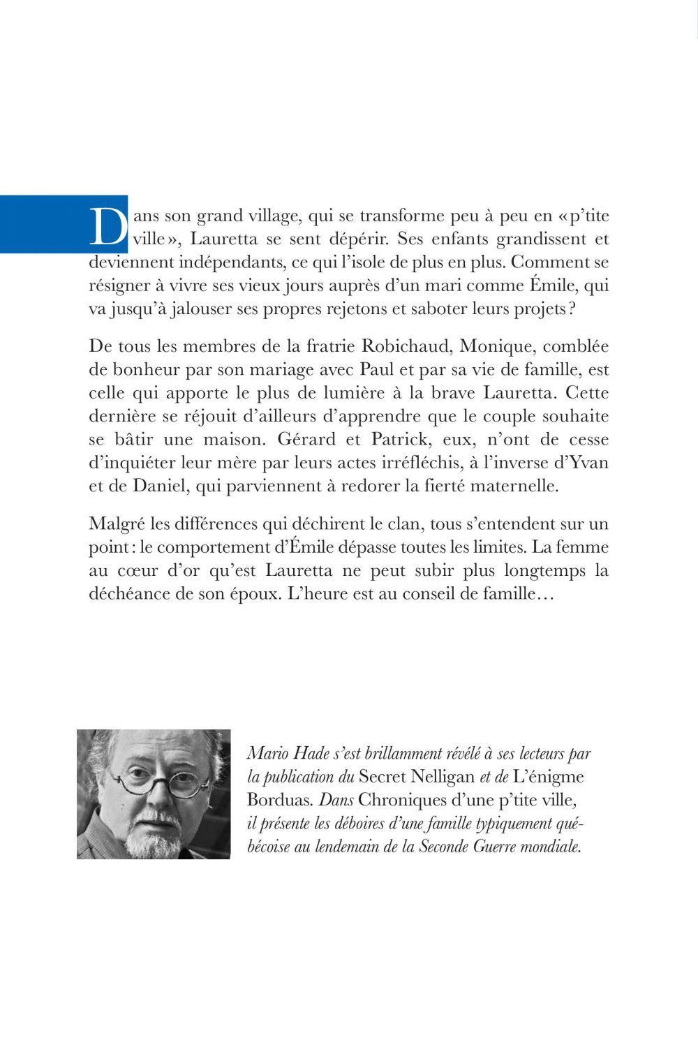Dans ce grand village qui devient rapidement une «?p'tite ville?», Lauretta se sent dépérir. Ses enfants grandissent et deviennent indépendants, ce qui l'esseule de plus en plus. Comment se résigner à vivre ses vieux jours auprès d'un mari comme Emile, qui va jusqu'à jalouser ses propres rejetons et saboter leurs projets?? De tous les enfants Robichaud, Monique, comblée de bonheur par son mariage avec Paul et par les enfants qui en découlent, est celle qui apporte le plus de lumière à la brave Lauretta. Cette dernière se réjouit d'ailleurs d'apprendre que le couple souhaite se bâtir une maison. Quant aux autres membres de la famille, certains, notamment Gérard et Laurent, n'ont de cesse d'inquiéter leur mère par leurs actes irréfléchis, mais il y en a toujours comme Yvan et Patrick pour redorer la fierté maternelle. Malgré les différences au sein du clan Robichaud, nul ne peut le nier?: le ras-le-bol à l'égard d'Emile est généralisé, et la situation s'aggrave. La femme au coeur d'or qu'est Lauretta ne peut subir plus longtemps la déchéance de son mari. L'heure est au conseil de famille.