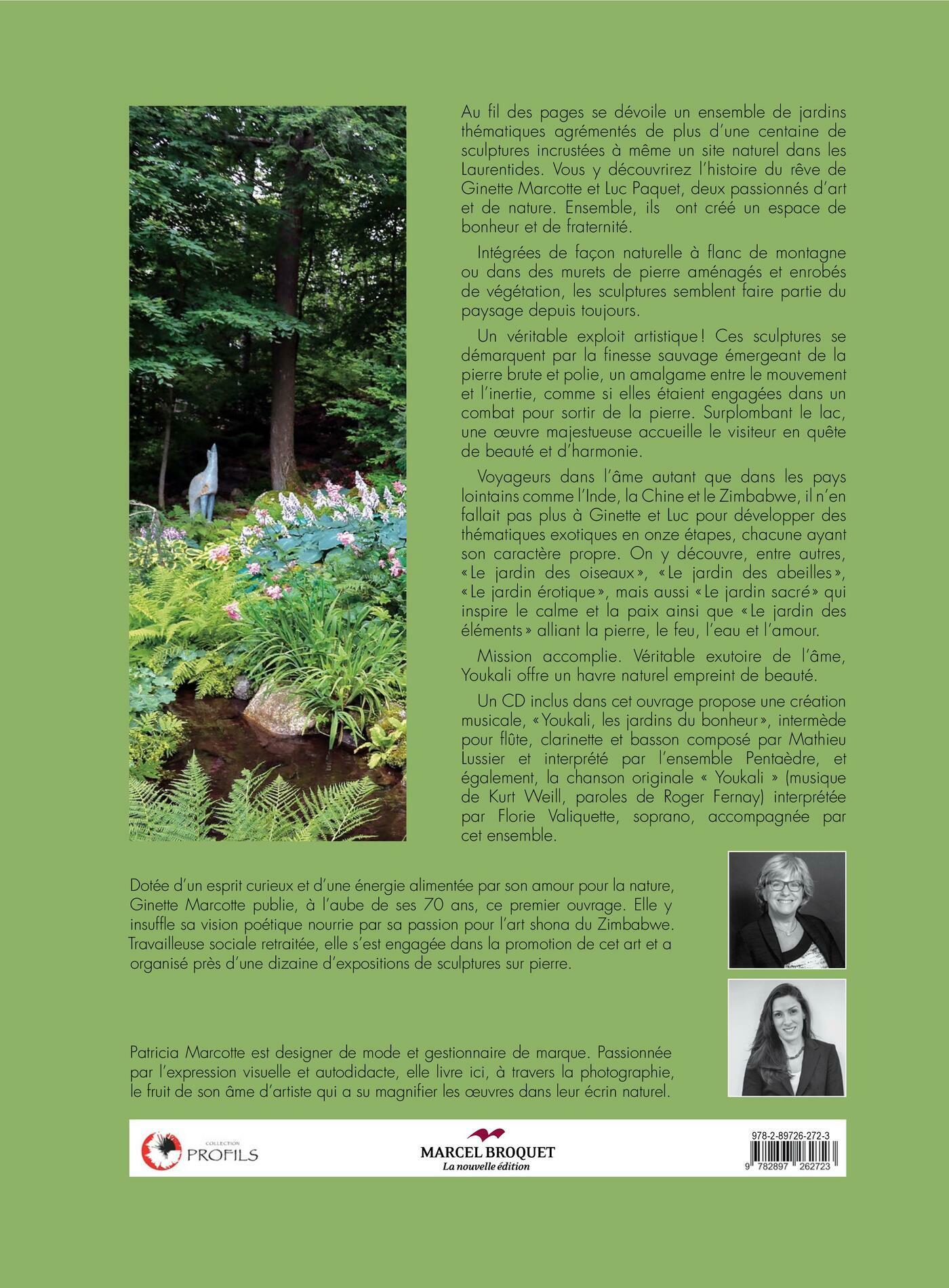 Au fil des pages se dévoile un ensemble de jardins thématiques agrémentés de plusd’une centaine de sculptures incrustées à même un site naturel dans les Laurentides.Vous y découvrirez l’histoire du rêve de Ginette Marcotte et Luc Paquet, deux passionnés d’art et de nature. Ensemble, ils ont créé un espace de bonheur et de fraternité. Intégrées de façon naturelle à flanc de montagne ou dans des murets de pierres aménagés et enrobés de végétation, les sculptures semblent faire partie du paysage depuis toujours.Un véritable exploit artistique ! Ces sculptures se démarquent par un amalgame de finesse sauvage émergeant de la pierre brute et polie, du mouvement et de l’inertie, comme si elles étaient engagées dans un combat pour sortir de la pierre. Surplombant le lac, une oeuvre majestueuse accueille le visiteur en quête de beauté et d’harmonie.Voyageurs dans l’âme autant que dans les pays lointains comme l’Inde, la Chine etl’Afrique, il n’en fallait pas plus pour développer des thématiques exotiques en onze étapes, chacune ayant son caractère propre. On y découvre, entre autres, « Le jardin des oiseaux », « Le jardin des abeilles », « Le jardin érotique », mais aussi « Le jardin Sacré » qui inspire le calme et la paix ainsi que « Le jardin des éléments » ralliant la pierre, le feu, l’eau et l’amour.Mission accomplie. Véritable exutoire de l’âme, Youkali offre un havre naturelempreint de beauté.Un CD inclus en cet ouvrage propose une création musicale, « Le youkali, les jardinsdu bonheur », intermède pour flûte, clarinette et basson composé par Mathieu Lussier et interprété l’ensemble Pentaèdre, et également, la chanson originale « Youkali » (musique de Kurt Weill, paroles de Roger Fernay) interprétée par Florie Valiquette, soprano, accompagnée par cet ensemble.