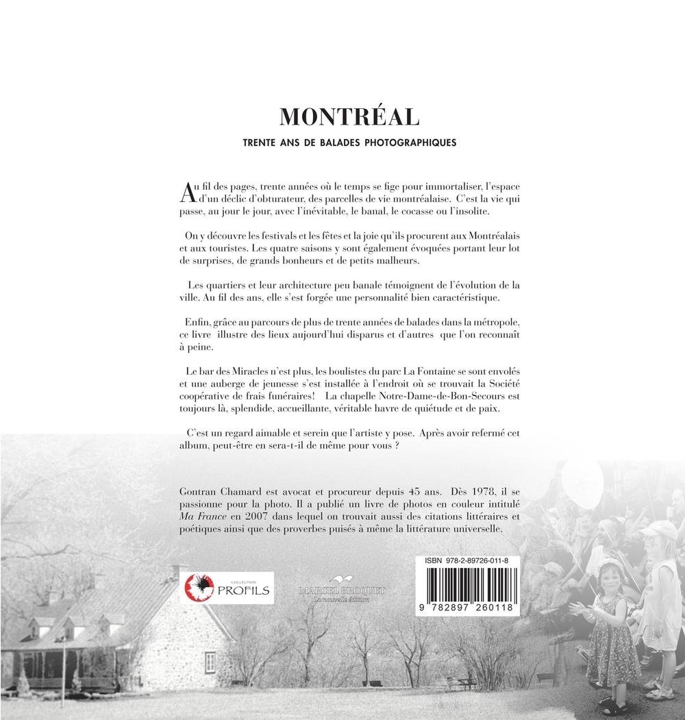 Au fil des pages, trente années où le temps se fige pour immortaliser, l’espace d’un déclic d’obturateur, des parcelles de vie montréalaise. C’est la vie qui passe, au jour le jour, avec l’inévitable, le banal, le cocasse ou l’insolite. On y découvre les festivals et les fêtes et la joie qu’ils procurent aux Montréalais et aux touristes. Les quatre saisons y sont également évoquées portant leur lot de surprises, de grands bonheurs et de petits malheurs. Les quartiers et leur l’architecture peu banale témoignent de l’évolution de la ville. Au fil des ans, elle s’est forgée une personnalité bien caractéristique. Enfin, grâce au parcours de plus de trente années de balades dans la métropole, ce livre illustre des lieux aujourd’hui disparus et d’autres que l’on reconnaît à peine. Le bar des Miracles n’est plus, les boulistes du parc Lafontaine se sont envolés et une auberge de jeunesse s’est installée à l’endroit où se trouvait la Société coopérative de frais funéraires! La chapelle Notre-Dame-de-Bon-Secours est toujours là, splendide, accueillante, véritable havre de quiétude et de paix. C’est un regard aimable et serein que l’artiste y pose. Après avoir refermé cet album, peut-être en sera-t-il de même pour vous?