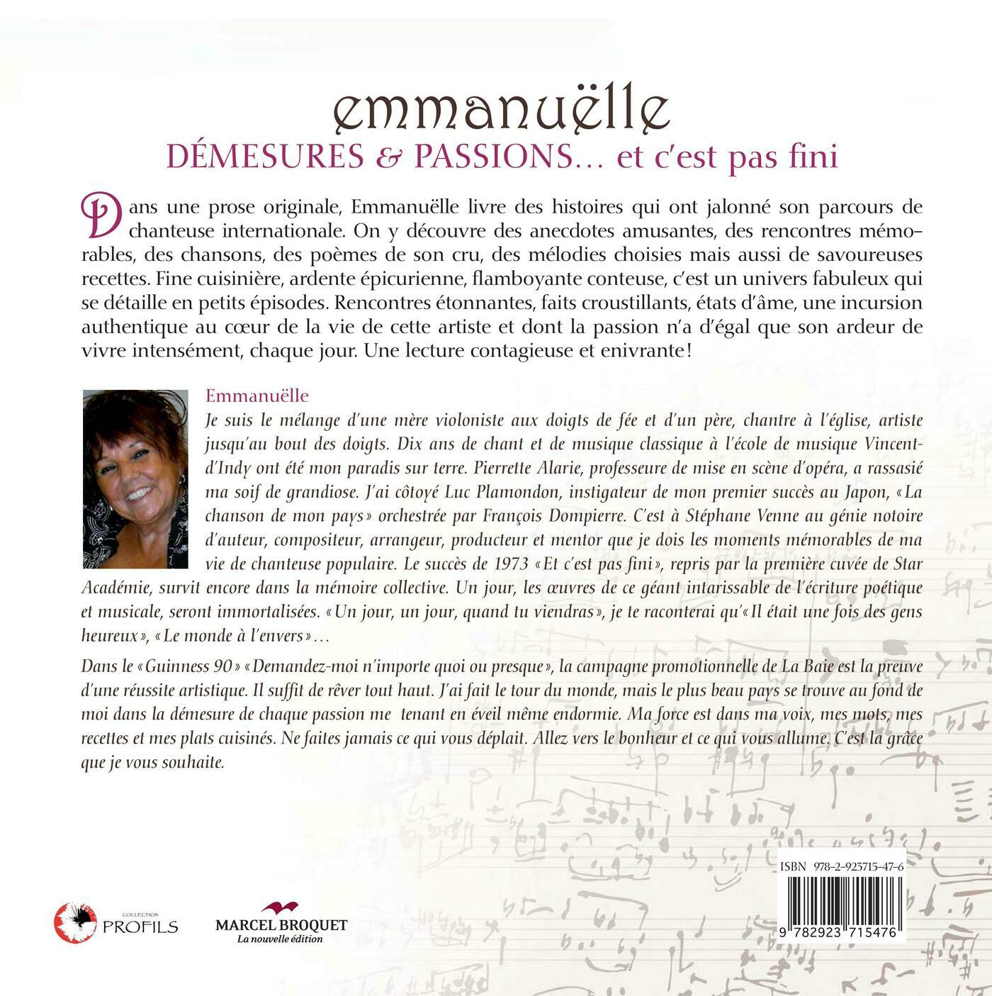 Dans une prose originale, Emmanuëlle, livre des histoires qui ont jalonné son parcours de chanteuse internationale. On y découvre des anecdotes amusantes, des rencontres mémorables, des chansons, des poèmes de son cru, des mélodies choisies mais aussi de savoureuses recettes. Fine cuisinière, ardente épicurienne, flamboyante conteuse, c'est un univers fabuleux qui se détaille en petits épisodes. Rencontres étonnantes, faits croustillants, états d'âme, une incursion authentique au c?ur de la vie de cette artiste et dont la passion n'a d'égal que son ardeur de vivre intensément, chaque jour. Une lecture contagieuse et enivrante !EmmanuëlleJe suis le mélange d'une mère violoniste aux doigts de fée et d'un père, chantre à l'église, artiste jsuqu'au bout des doigts. Dix ans de chant et de musique classique à l'école de musique Vincent-d'Indy ont été un vrai paradis. Pierrette Alarie, professeure de mise en scène d'opéra, a rassasié ma soif de grandiose. J'ai côtoyé Luc Plamondon, instigateur de mon premier succès au Japon,'' La chanson de mon pays',' orchestrée par François Dompierre. C'est à Stéphane Venne au génie notoire d'auteur, compositeur, arrangeur, producteur et mentor que je dois les moments mémorables de ma vie de chanteuse populaire. Le succès de 1973 ''Et c'est pas fini'', repris par la première cuvée de Star Académie, survit encore dans la mémoire collective. Un jour, les ?uvres de ce géant intarissable de l'écriture poétique et musicale, seront immortalisées. ''Un jour, un jour, quand tu viendras '', je te raconterai qu'''Il était une fois des gens heureux'', ''Le monde à l'envers ''?Dans le ''Guinness 90'' ''Demandez-moi n'importe quoi ou presque'', la campagne promotionnelle de La Baie, est la preuve d'une réussite artistique. Il suffit de rêver tout haut. J'ai fait le tour du monde, mais le plus beau pays se trouve au fond de moi dans la démesure de chaque passion me tenant en éveil même endormie. Ma force est dans ma voix, mes mots, mes recettes et mes plats cuisinés. Ne faites jamais ce qui vous déplait. Allez vers le bonheur et ce qui vous allume. C'est la grâce que je vous souhaite.