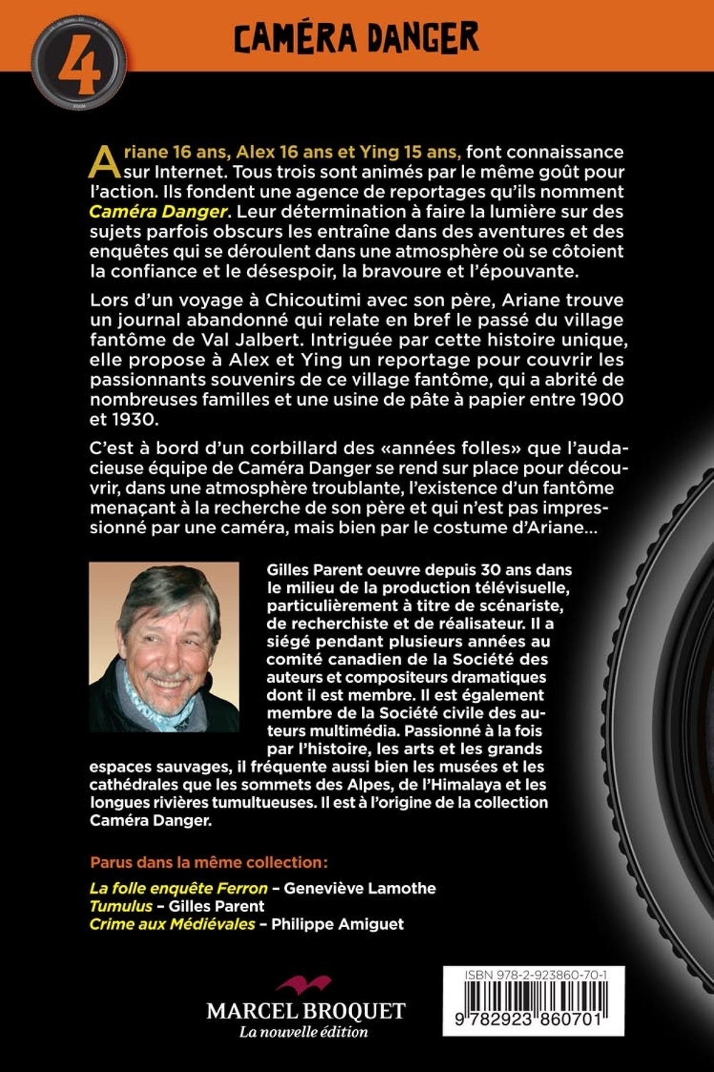 Ariane 16 ans, Alex 16 ans et Ying 15 ans, font connaissance sur l’Internet.Tous troisanimés aiment l’action et décident de fonder une agence de reportages qu’ils nomment Caméra Danger. Leur détermination à faire la lumière sur des sujets parfois obscurs, les entraîne dans des aventures et des enquêtes qui se déroulent dans une atmosphère où se côtoient la confiance et le désespoir, la bravoure et l’épouvante. Lors d’un voyage à Ville Saguenay (Chicoutimi) avec son père, Ariane trouve un journal abandonné qui relate en bref le passé du village fantôme de Val Jalbert. Intriguée par cette histoire unique, elle propose à Alex et Ying un reportage pour couvrir les passionnants souvenirs de ce village fantôme, qui a abrité de nombreuses familles et une usine de pâte à papier entre 1900 et 1930.C’est à bord d’un corbillard des «années folles» que l’audacieuse équipe de Caméra Danger se rend sur place pour découvrir, dans une atmosphère troublante, l’existence d’un fantôme menaçant à la recherche de son père et qui n’est pas impressionné par une caméra, mais bien par le costume d’Ariane…