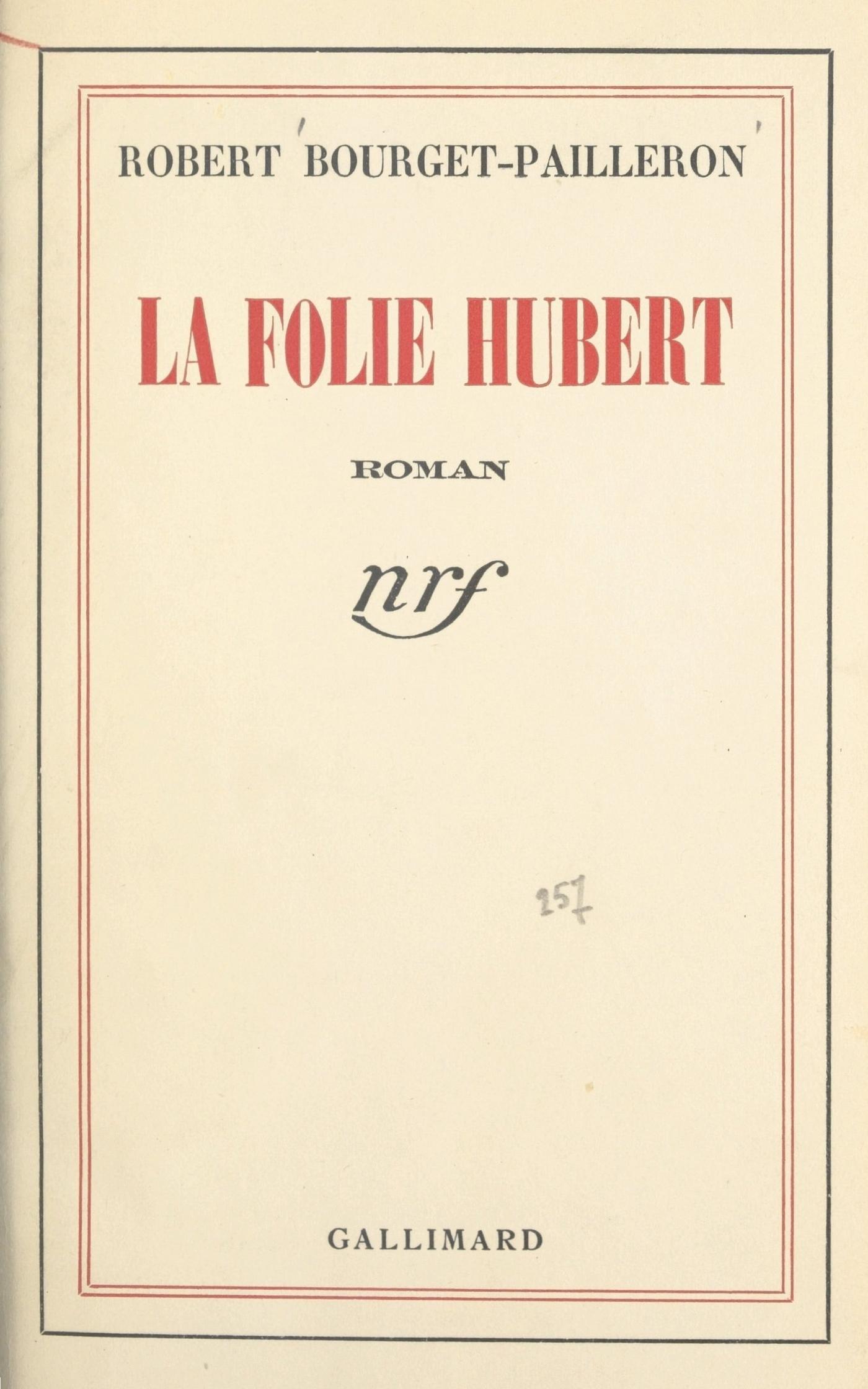 Quand on lui demandait des nouvelles de son mari, parti le 1er août 1914 avec son bataillon de chasseurs, Mme Hardouin en parlait comme s’il se fût agi du défilé du 14 Juillet. La carrière de son mari, ses chances d’avancement figuraient parmi des préoccupations qu’elle exprimait en des termes semblables à ceux du temps de paix. Même le décès de leur fils Marc, fauché en Champagne, à seulement dix-neuf ans, huit jours après son arrivée au Front, ne semblait pas altérer cette légèreté apparente… La Folie Hubert est un roman de Robert Bourget-Pailleron, récompensé par le Grand Prix du roman de l'Académie française en 1941.